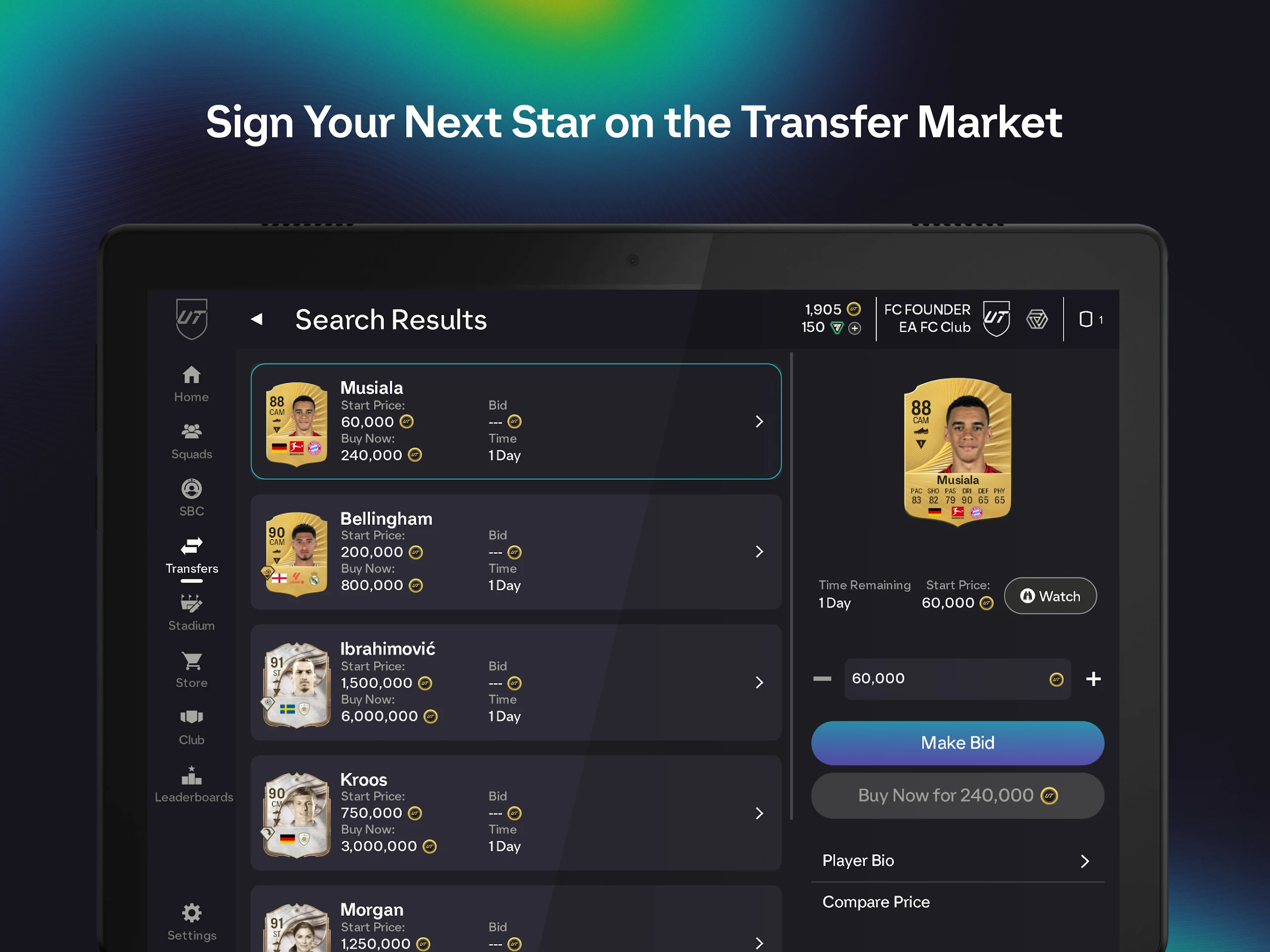 Engage in player transactions with the global Ultimate Team Community within the Transfer Market to enhance the strength of your team.