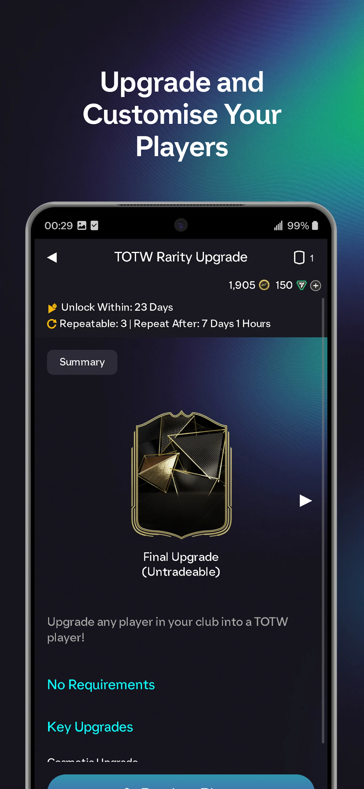 Transform your favorite players into club icons and stay updated on the latest Evolutions wherever you are. Develop players, unlock Evolutions, and secure level upgrades conveniently from your mobile device.
