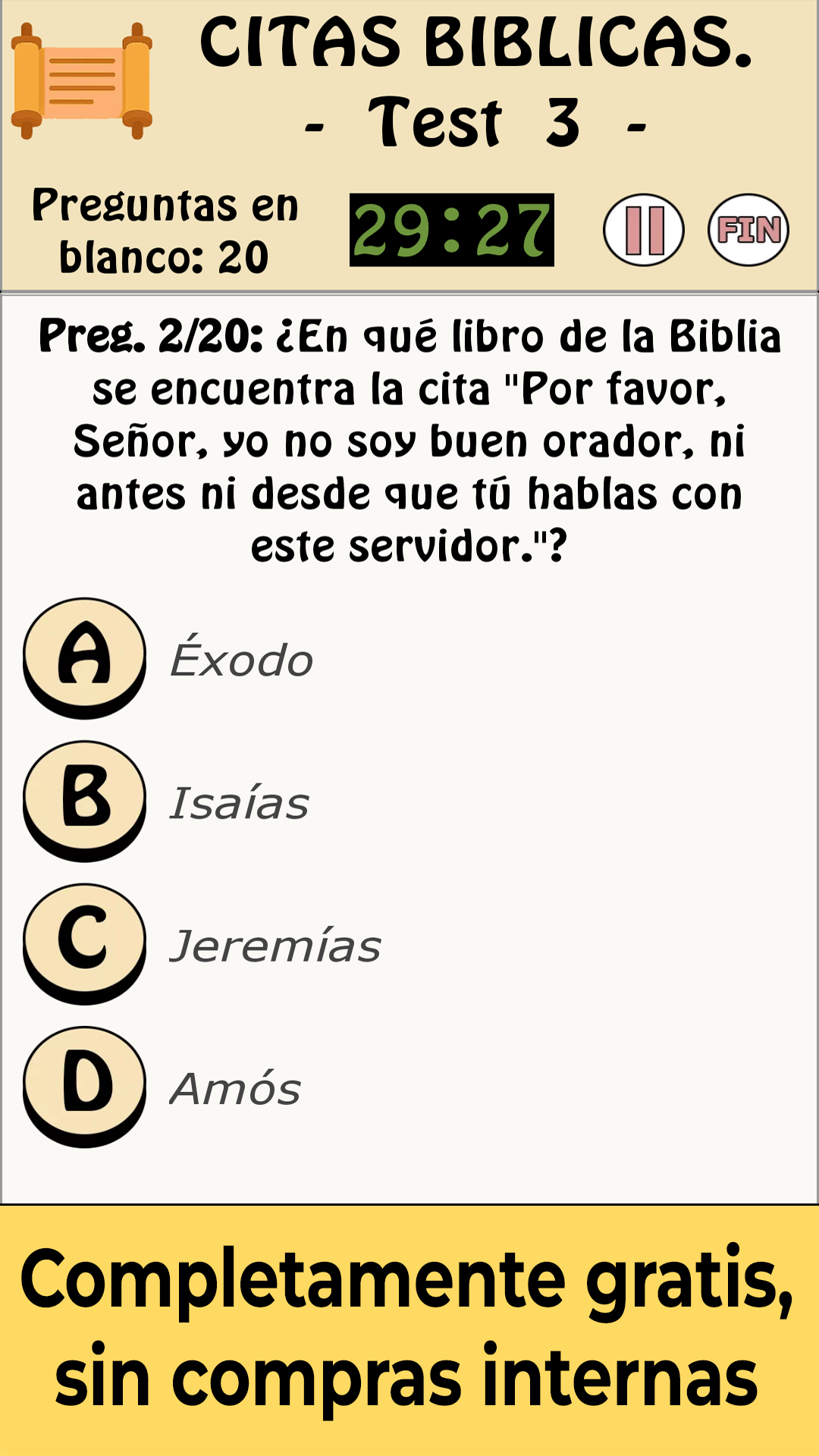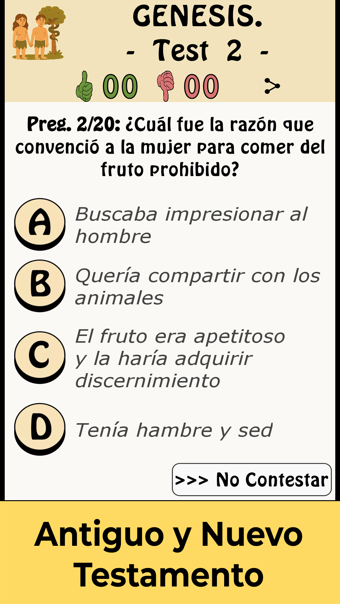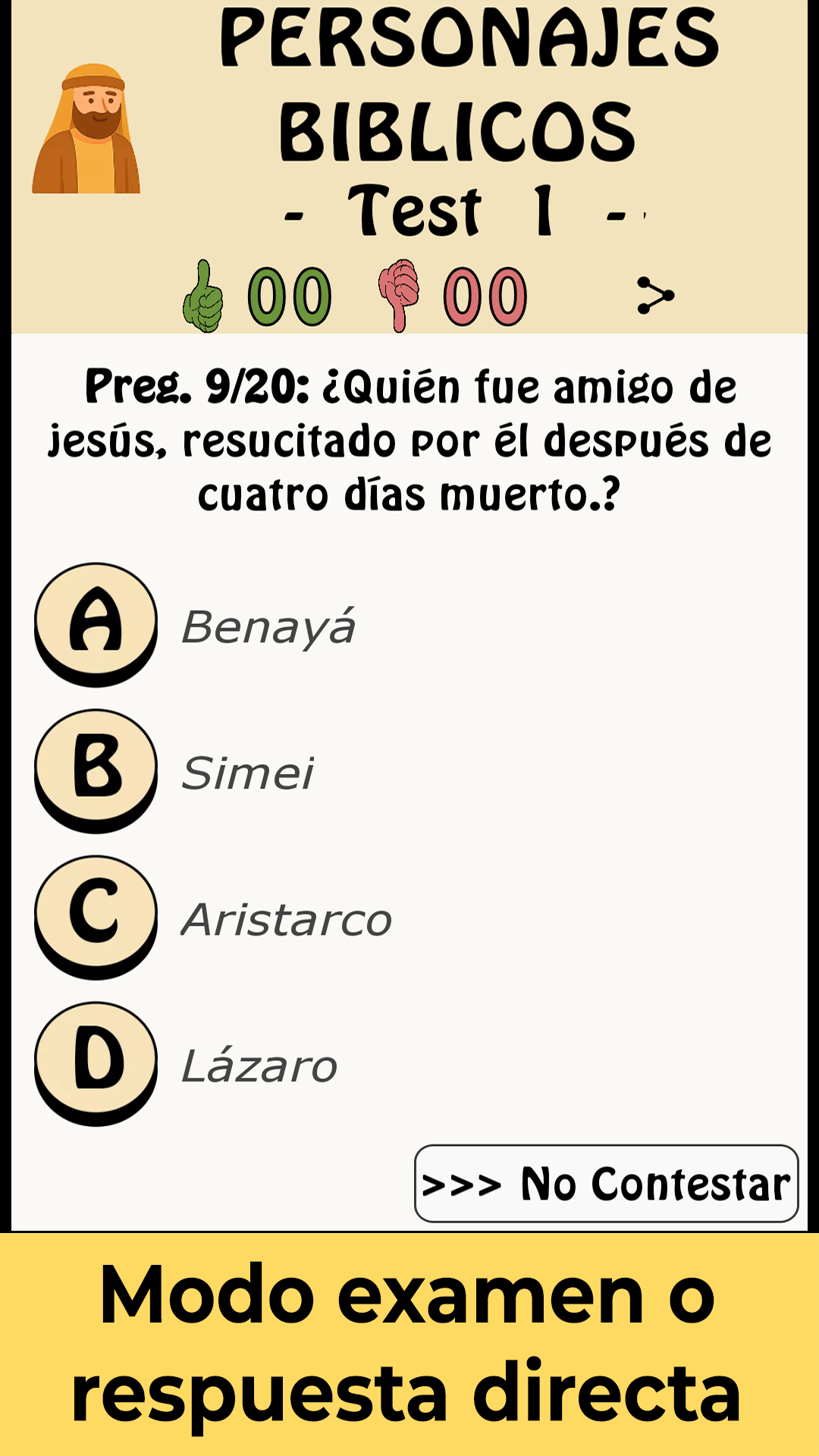 In this application you can test yourself in exam mode or with quick questions, on issues from the Old Testament, New Testament, biblical characters, biblical quotes and general questions. With more than five hundred tests and seven thousand questions, you will never find the same question twice. Take full tests and find out how many answers you got right at the end or ask quick questions and find out if you got it wrong by clicking on the answer you think is correct.