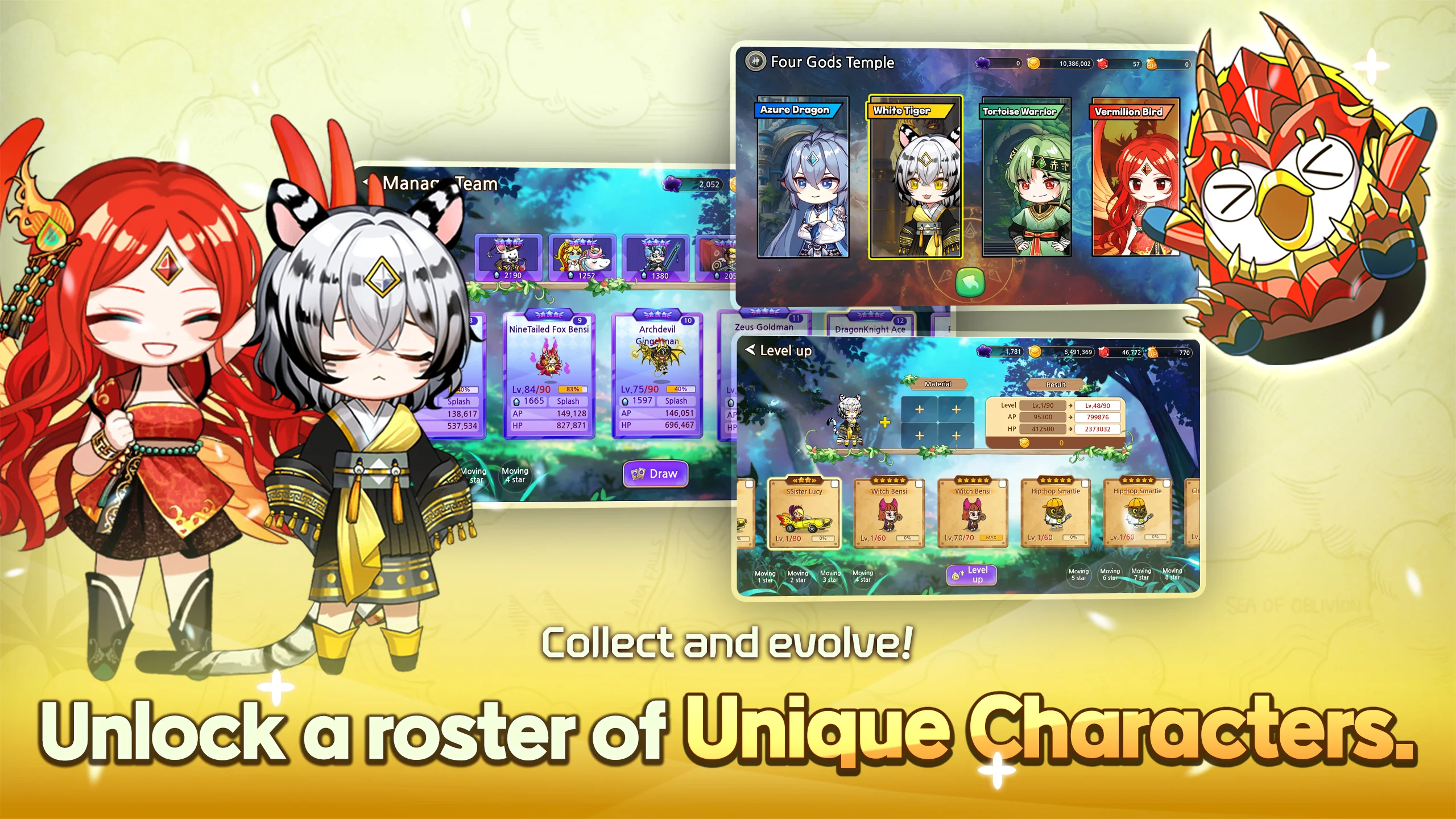 The game offers diverse content including a story-driven Stage Mode (with Normal and Hard difficulties), daily rotating dungeons, player-vs-player (PVP) arena matches, an endless survival mode (Sky Garden), and a cooperative weekly World Boss battle.