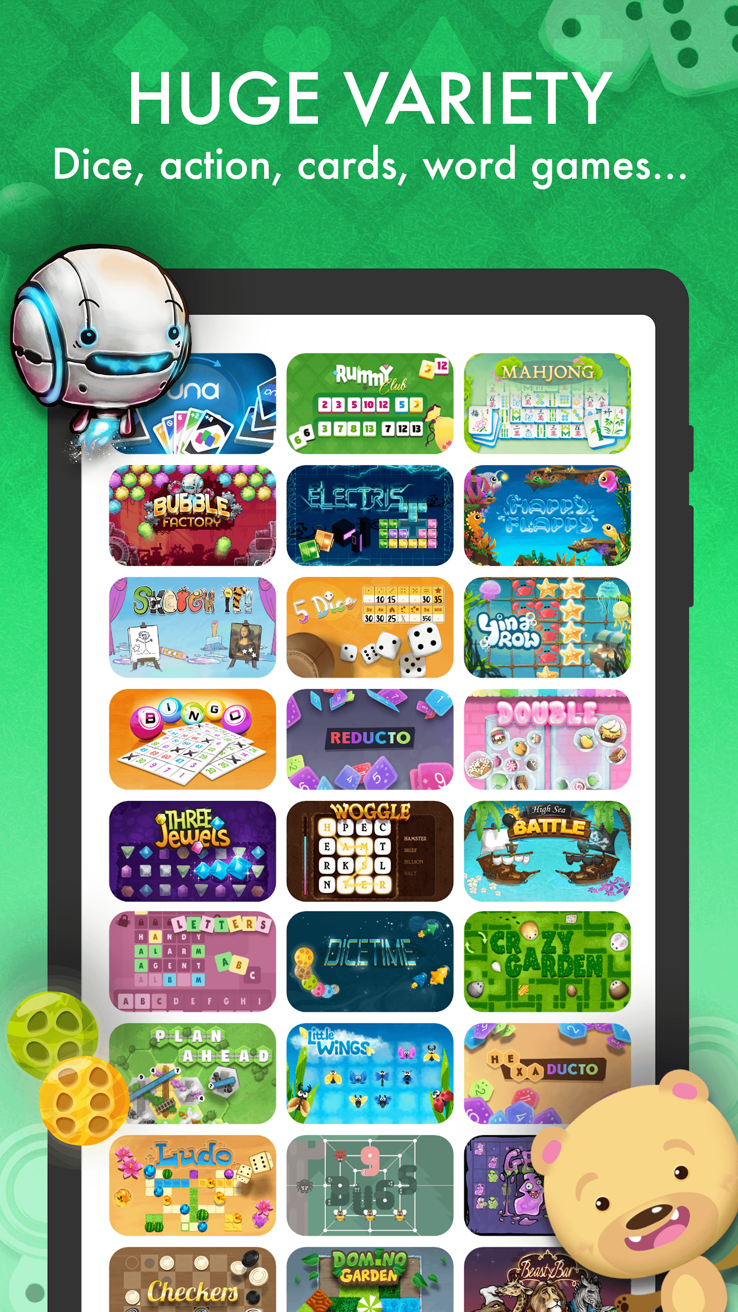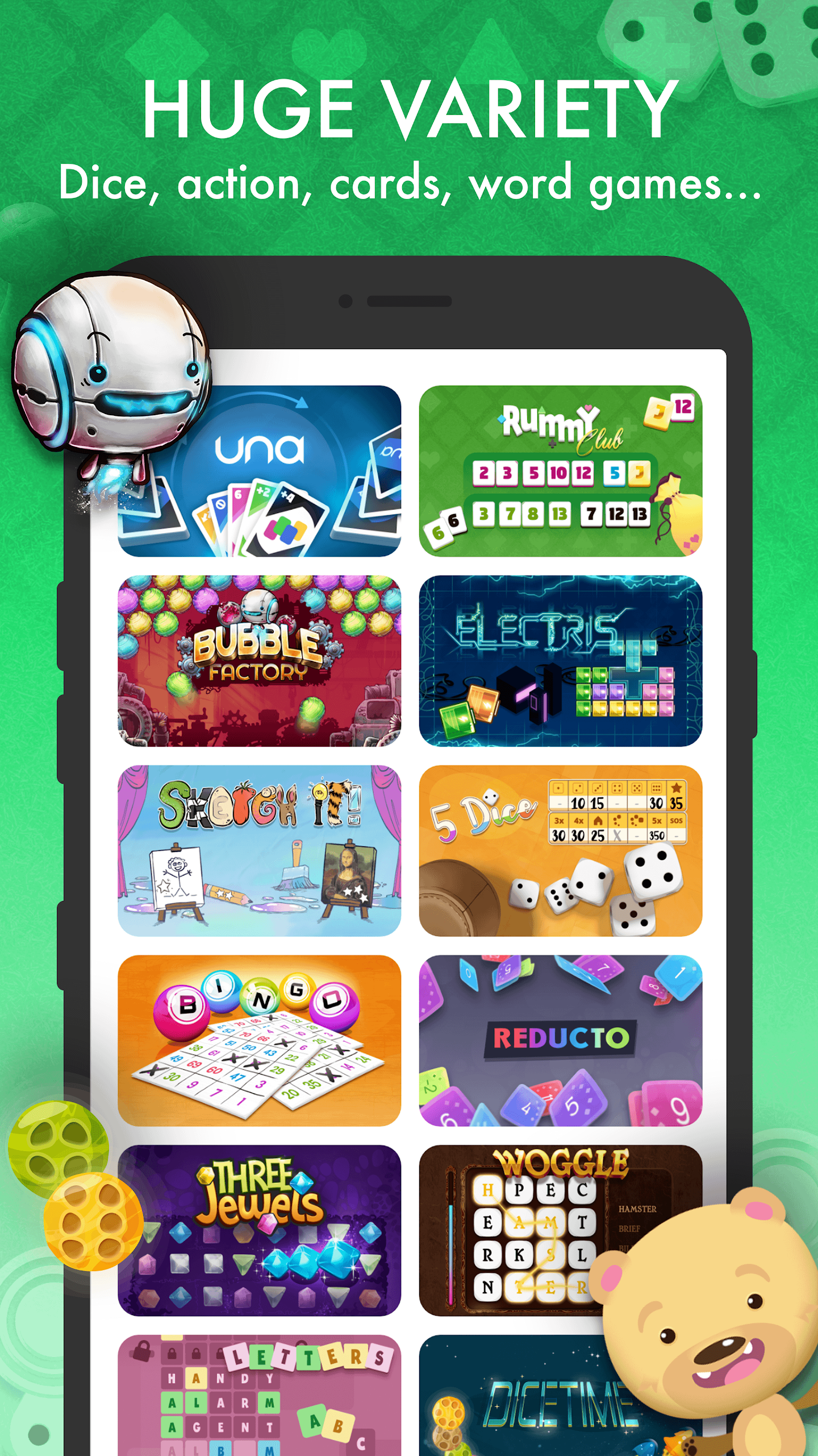 elo presents not only a curated collection of beautifully crafted games—each thoughtfully designed for an optimal mobile gaming experience—but also boasts a wide variety. Along with more than 60 games available, a new one is introduced each month. Our top favorites include Rummy, Una, and Reducto, while timeless classics such as Nine Men’s Morris, Checkers, Chess, and Go remain popular. Additionally, you can explore dice games like TwentyOne and Qwixx, action games like Ubongo or Double, word games, and a variety of Trivia Quizzes.
