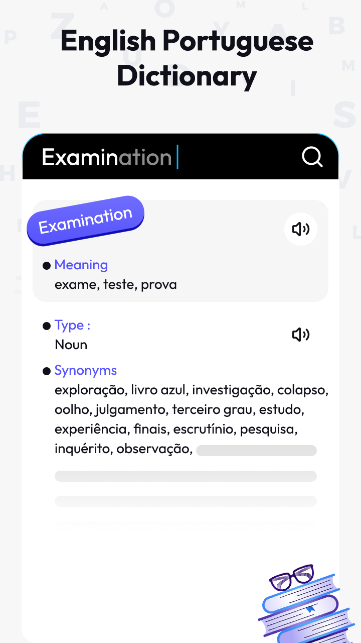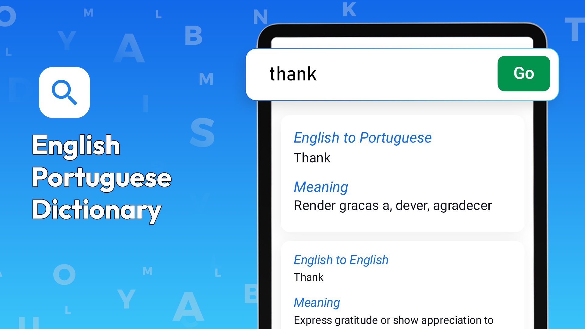 Utilize the dictionary feature to enhance your English vocabulary. Look up the meaning of any English word and access all the relevant information. English to Portuguese Dictionary and Portuguese to English Dictionary, along with the Portuguese-English Translator app, allow you to type in the English word or search through voice command.