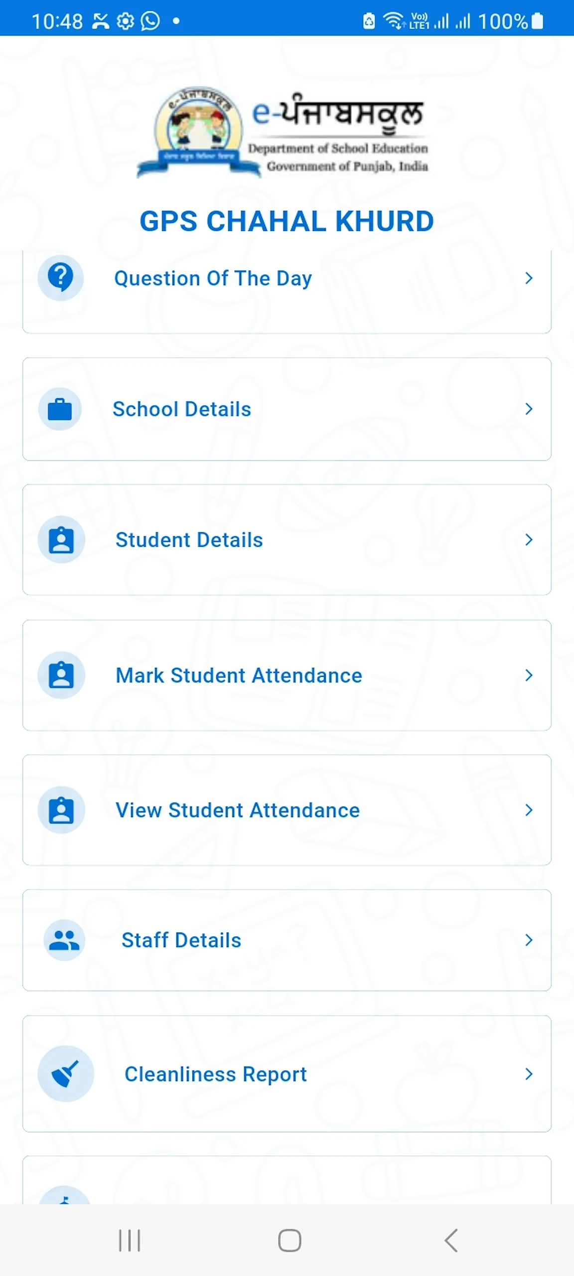The application has been designed to facilitate straightforward and user-friendly login access for educational institutions to Epunjab from Android devices. This platform allows schools to access information regarding school specifics, staff members, and students as recorded on ePunjab. Additionally, it provides functionalities for recording attendance of both staff and students, reviewing attendance records, and submitting as well as accessing reports related to the Mid-Day Meal (MDM) program and cleanliness. Each institution under the Punjab Government Education Department is required to submit daily MDM and cleanliness updates using this application.