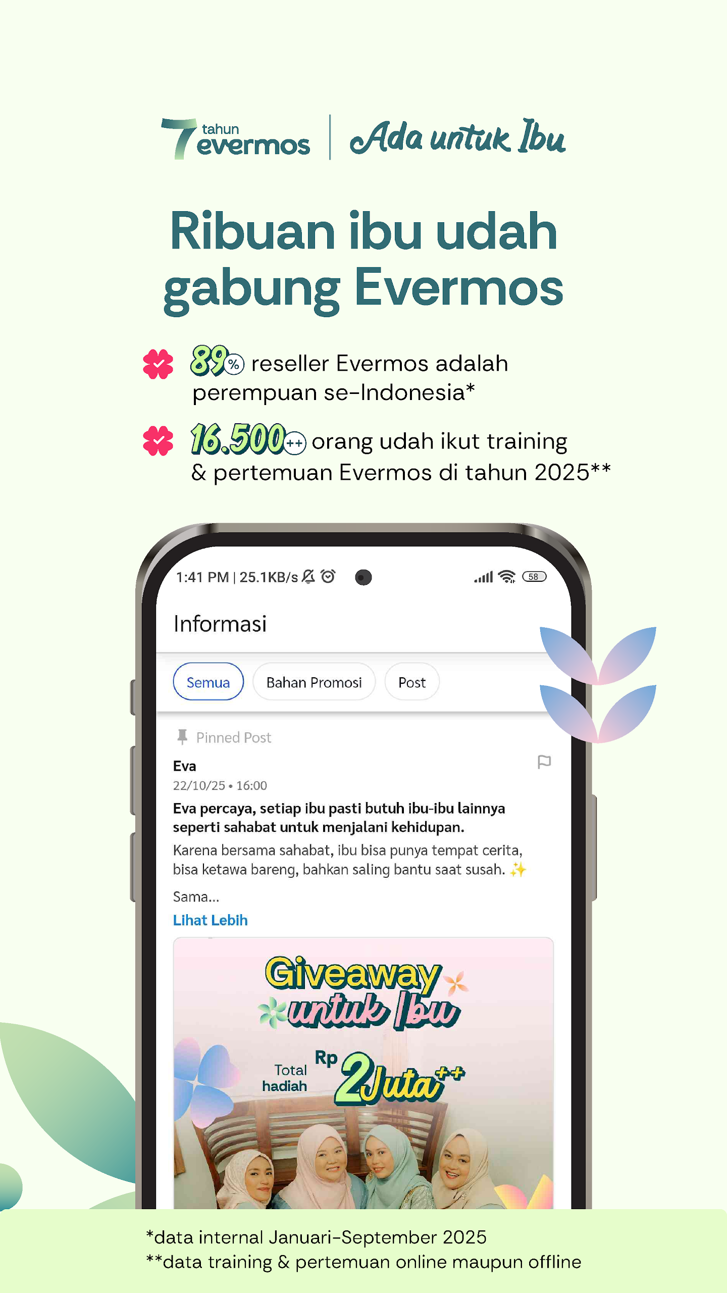 Get the latest, trustworthy information and attractive promotions through the Facebook Group Business Learning Community by Evermos, Instagram and TikTok @evermos_id, YouTube Evermos Official, Facebook Evermos, and.