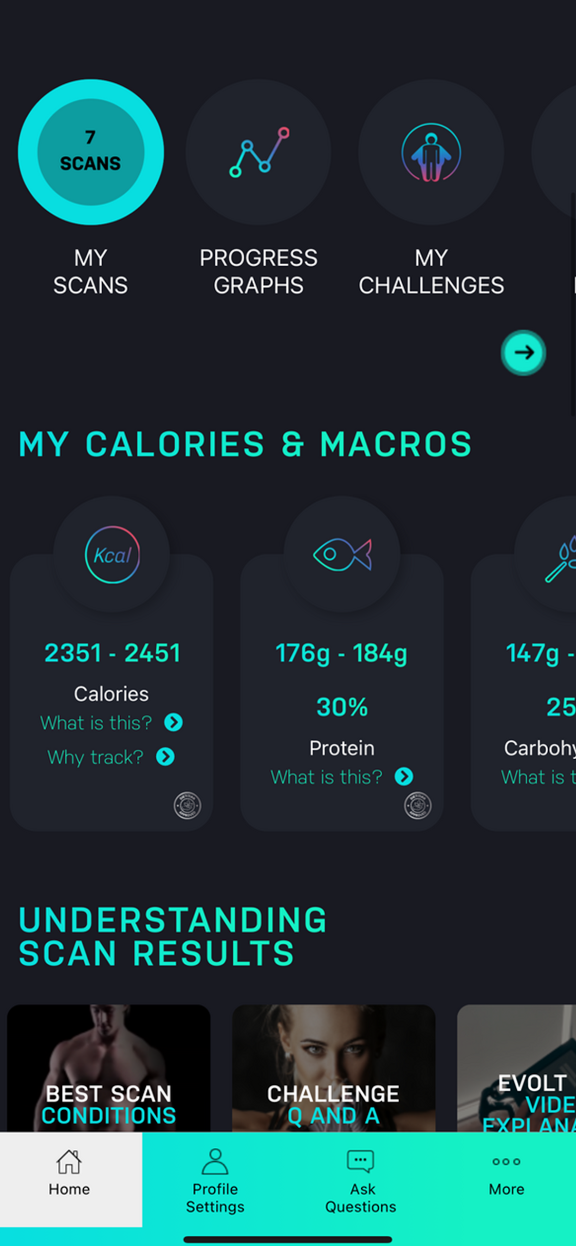 To view your Macro’s you must download the App and sign up before getting the Evolt 360 Scan. Using your details, log into the Evolt 360 kiosk and complete a scan. The result will automatically fire to your Evolt Active. Head to the “Profile” section and view your individualized macro profile under the “My Macro’s tab”