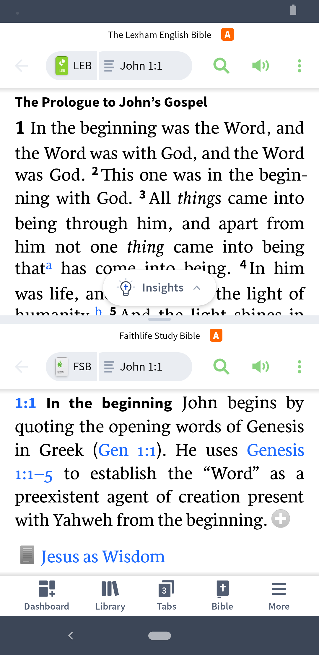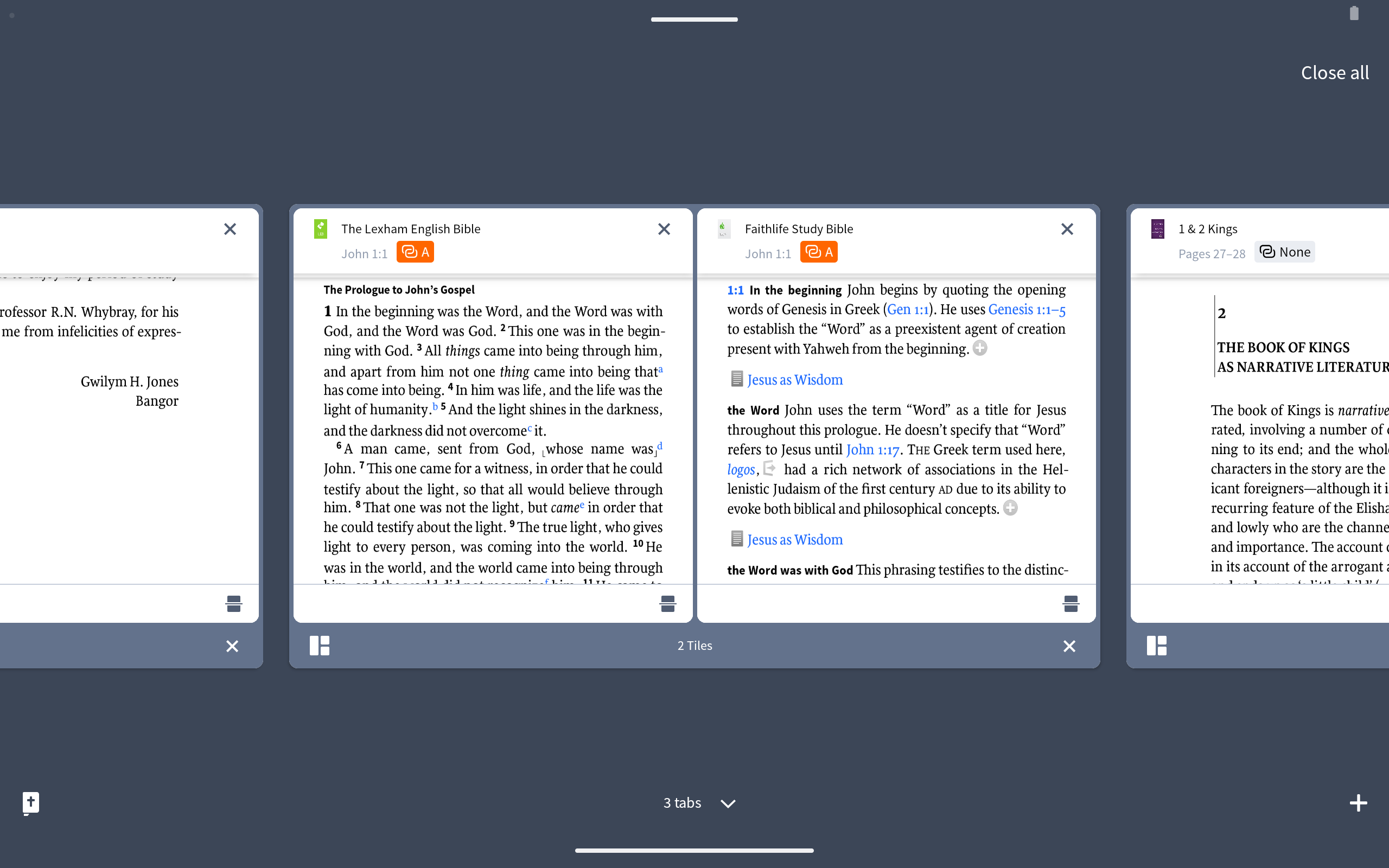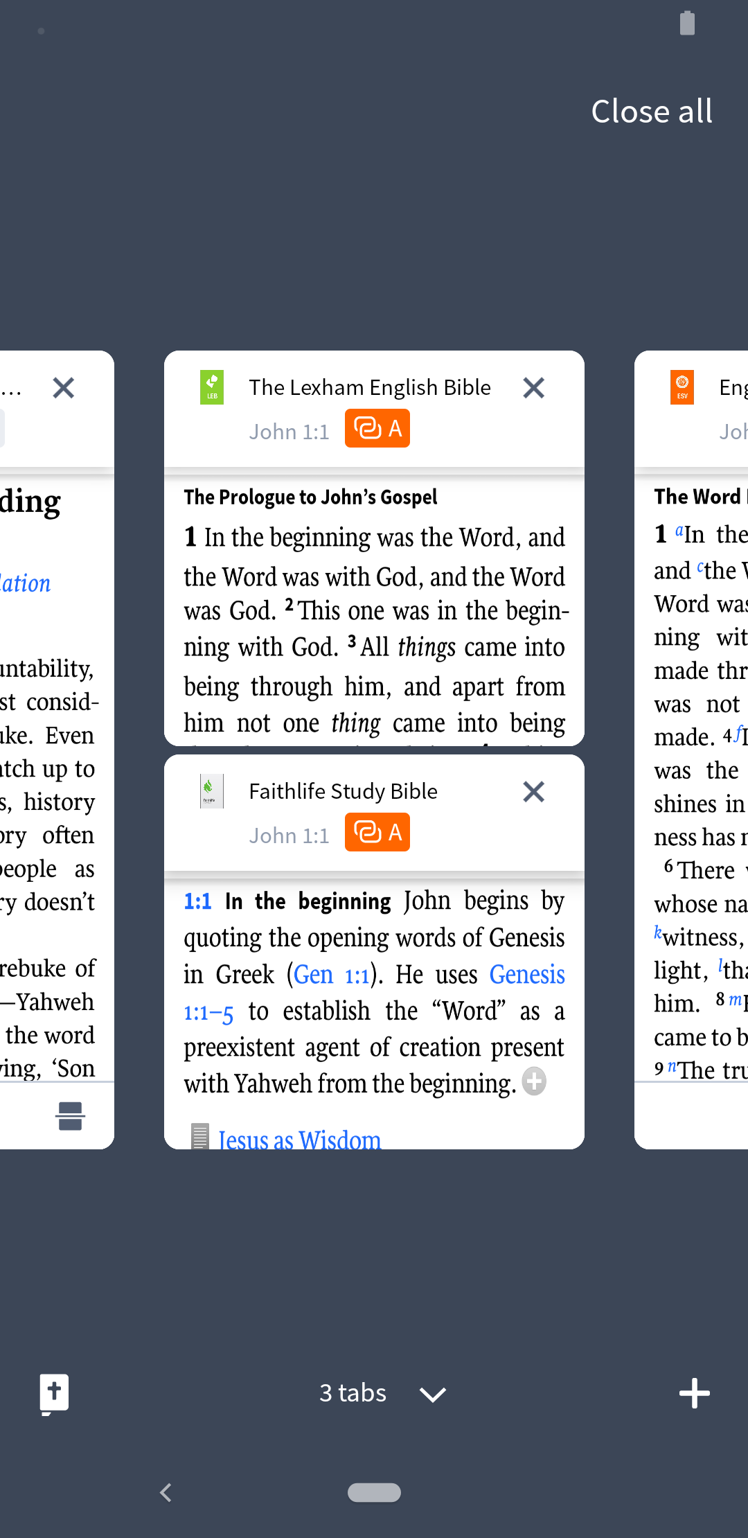 TABBED BROWSING - Open multiple resources or Bibles simultaneously and view them side by side.