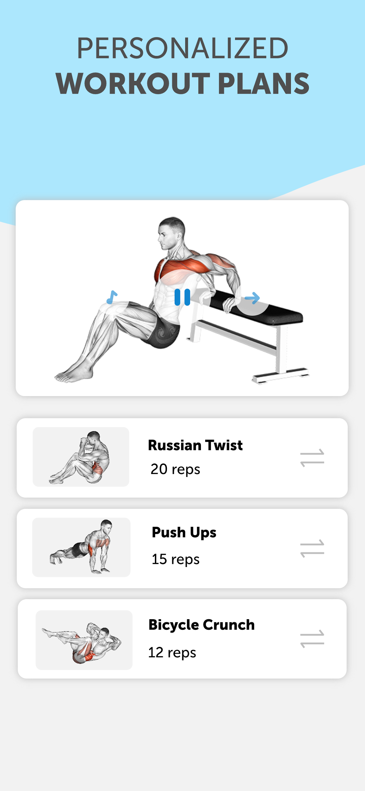 Whether you're exercising at home or going to the gym, our intelligent algorithm has created a customized 8-week workout plan tailored to your objectives, fitness level, and physical state. Our workouts are designed to be flexible and offer an optimal mix of exercises, frequency, repetitions, sets, and rest periods to assist you in achieving your fitness aspirations.