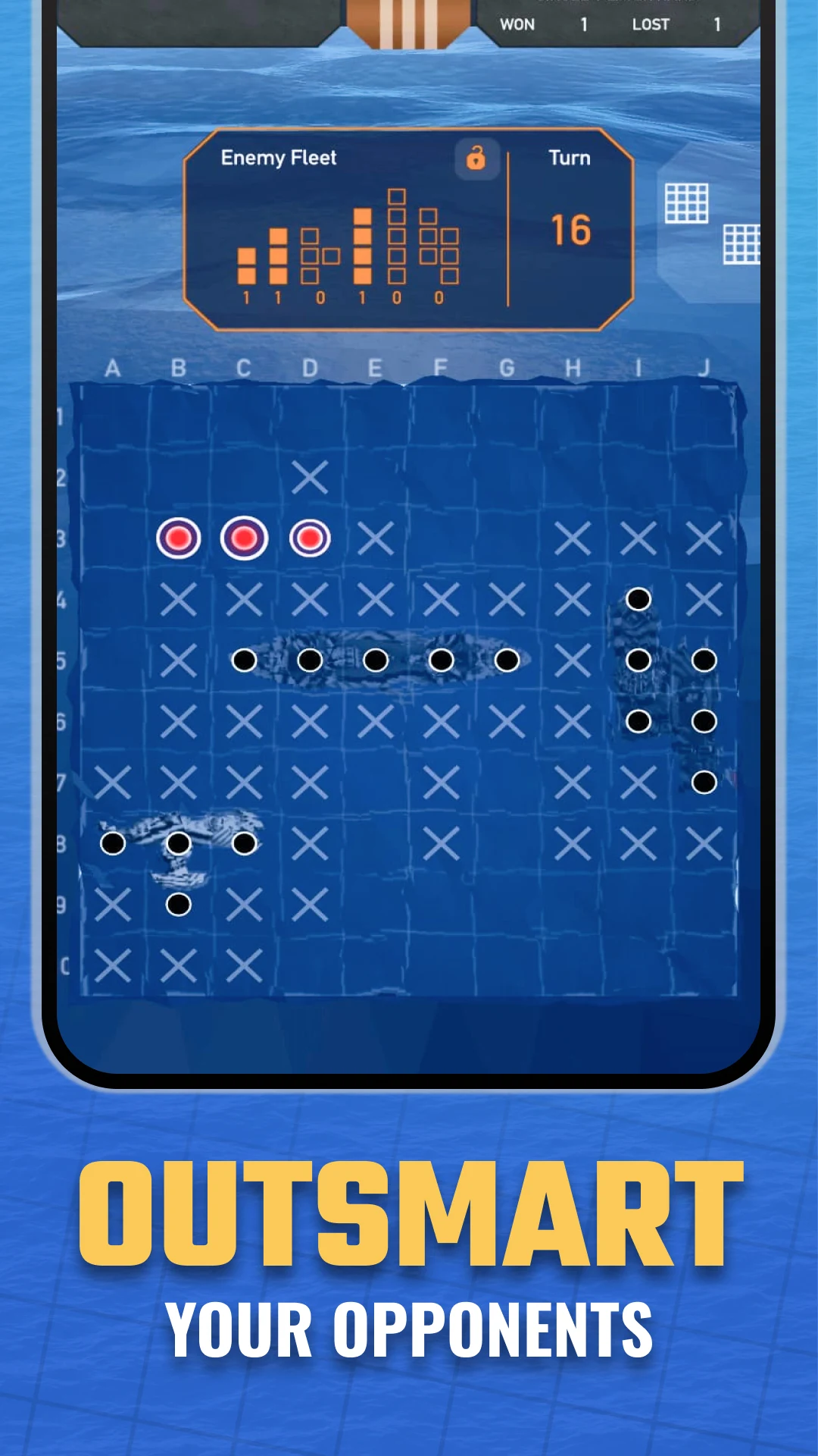 The visual design in Fleet Battle is quite simple and reminiscent of the classic board game. Your plan of action will consist of tapping on a certain square to try and hit one of your enemy's ships. Try to hit each of your opponent's ships until you sink them.