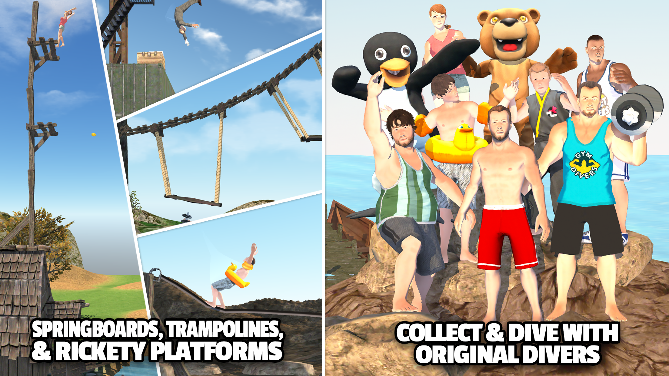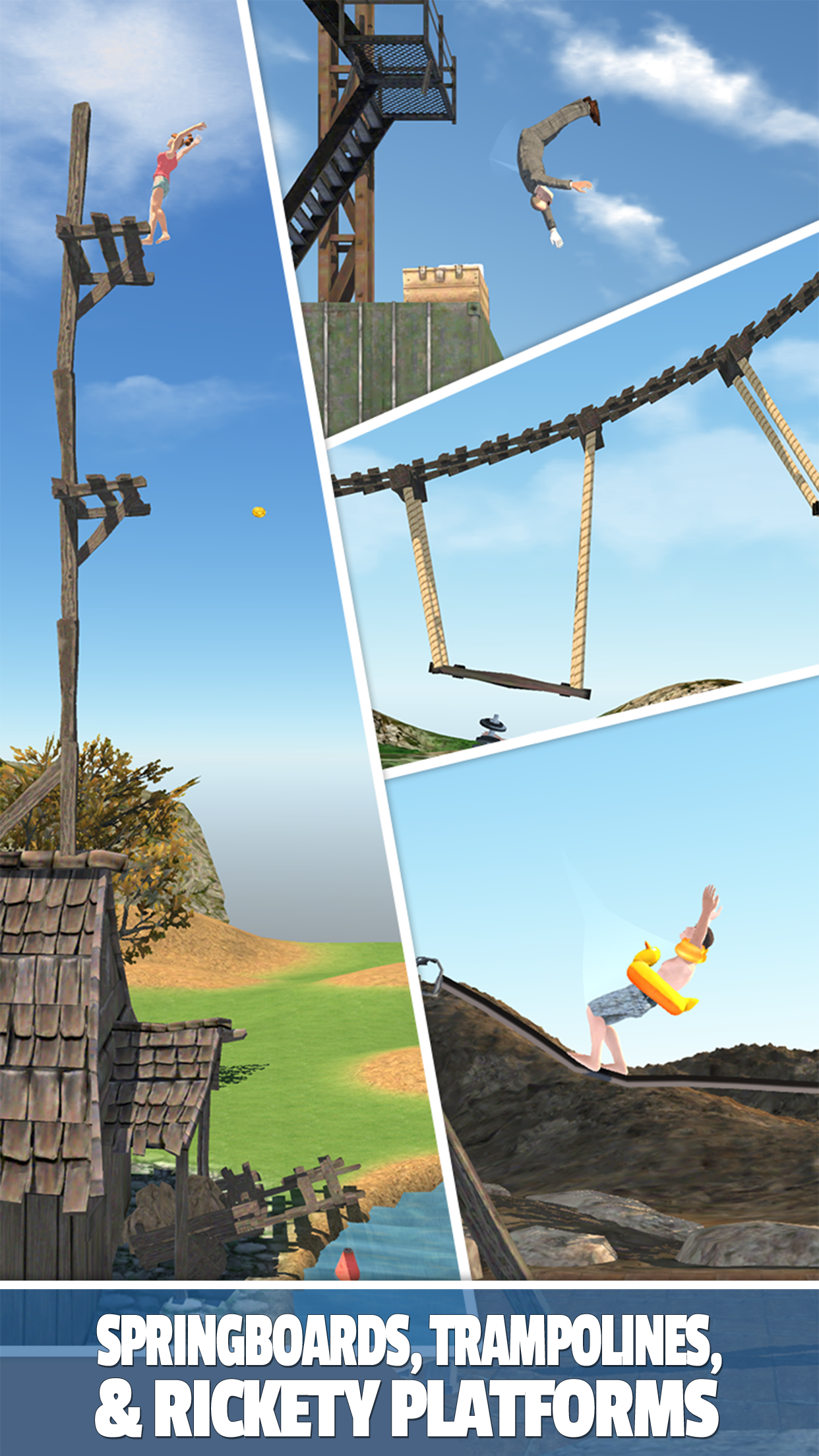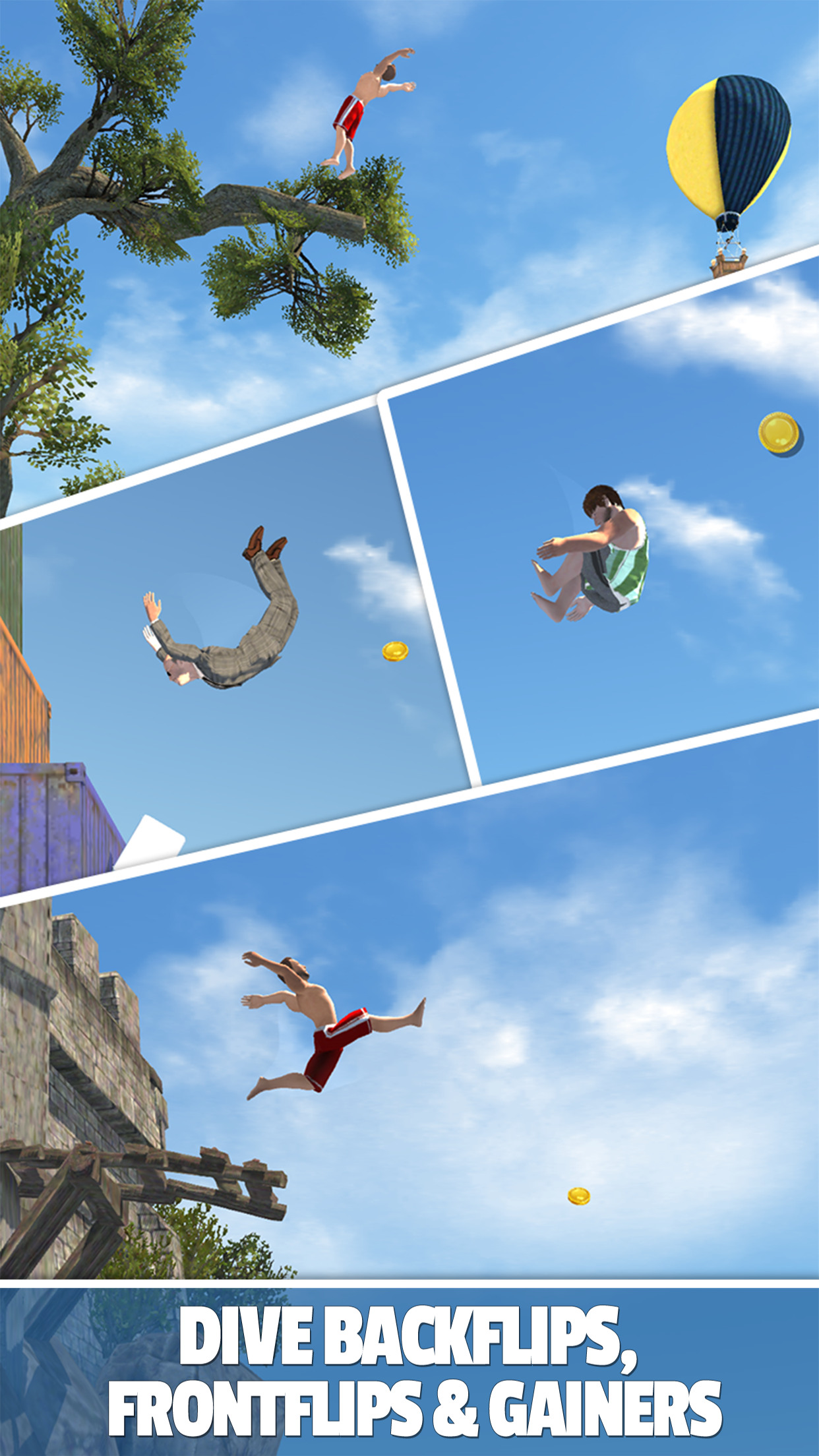 The premier cliff diving game in the world, now available on your mobile device! • Demonstrate impressive Frontflips, Backflips, and Gainers from various daring locations such as high cliffs, precarious platforms, trees, castles, and trampolines! Select from a diverse group of divers, unlock new stunts and maneuvers. Strive for a flawless entry into the water while steering clear of rocks! Incorporating a specialized physics engine with lively ragdoll physics, Flip Diving offers the most vibrant and enjoyable cliff diving encounter ever crafted!