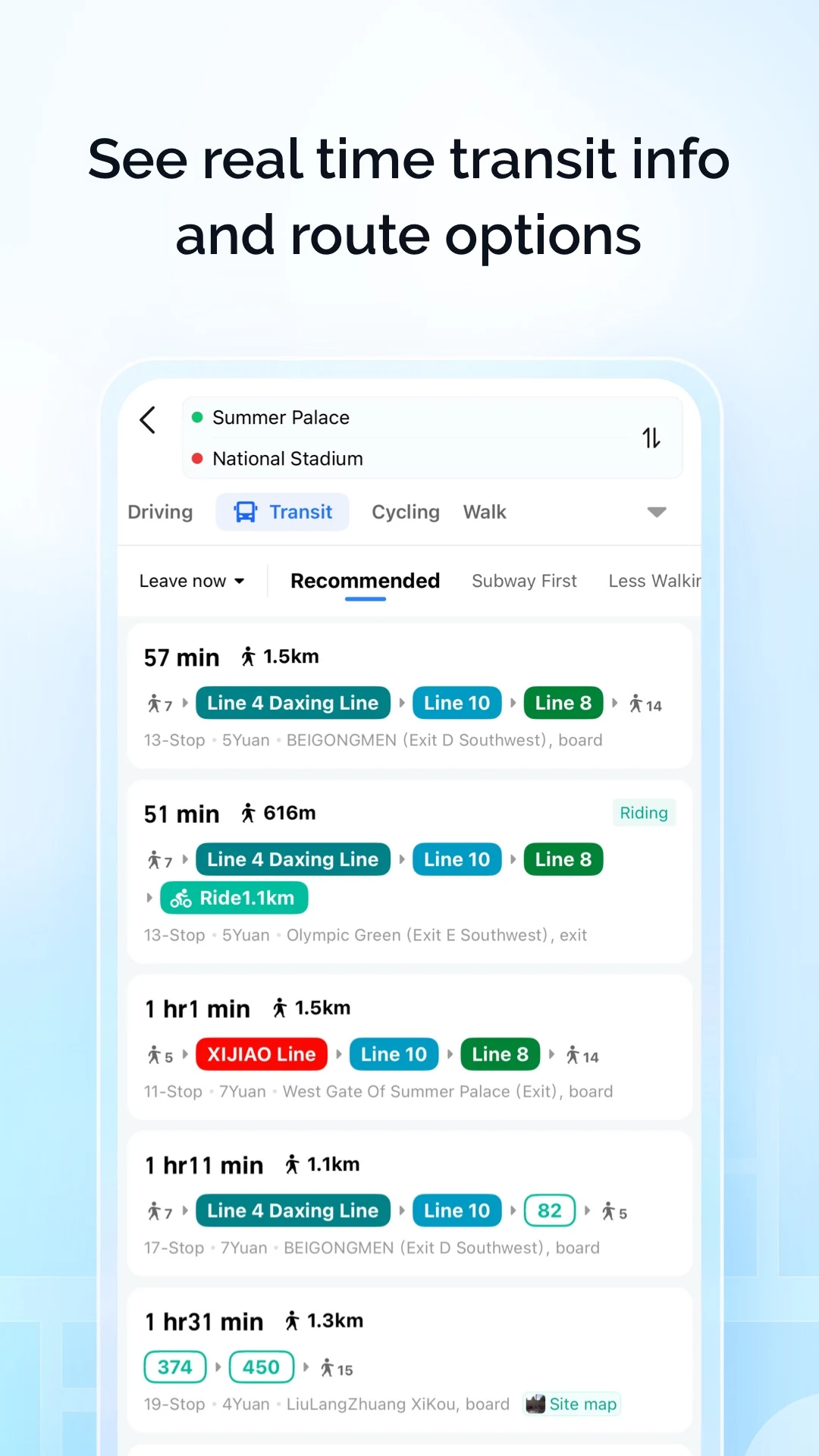 Provides intelligent navigation for various modes of transportation including driving, taxi, bus, cycling, walking, truck, motorcycle, and new energy vehicles
