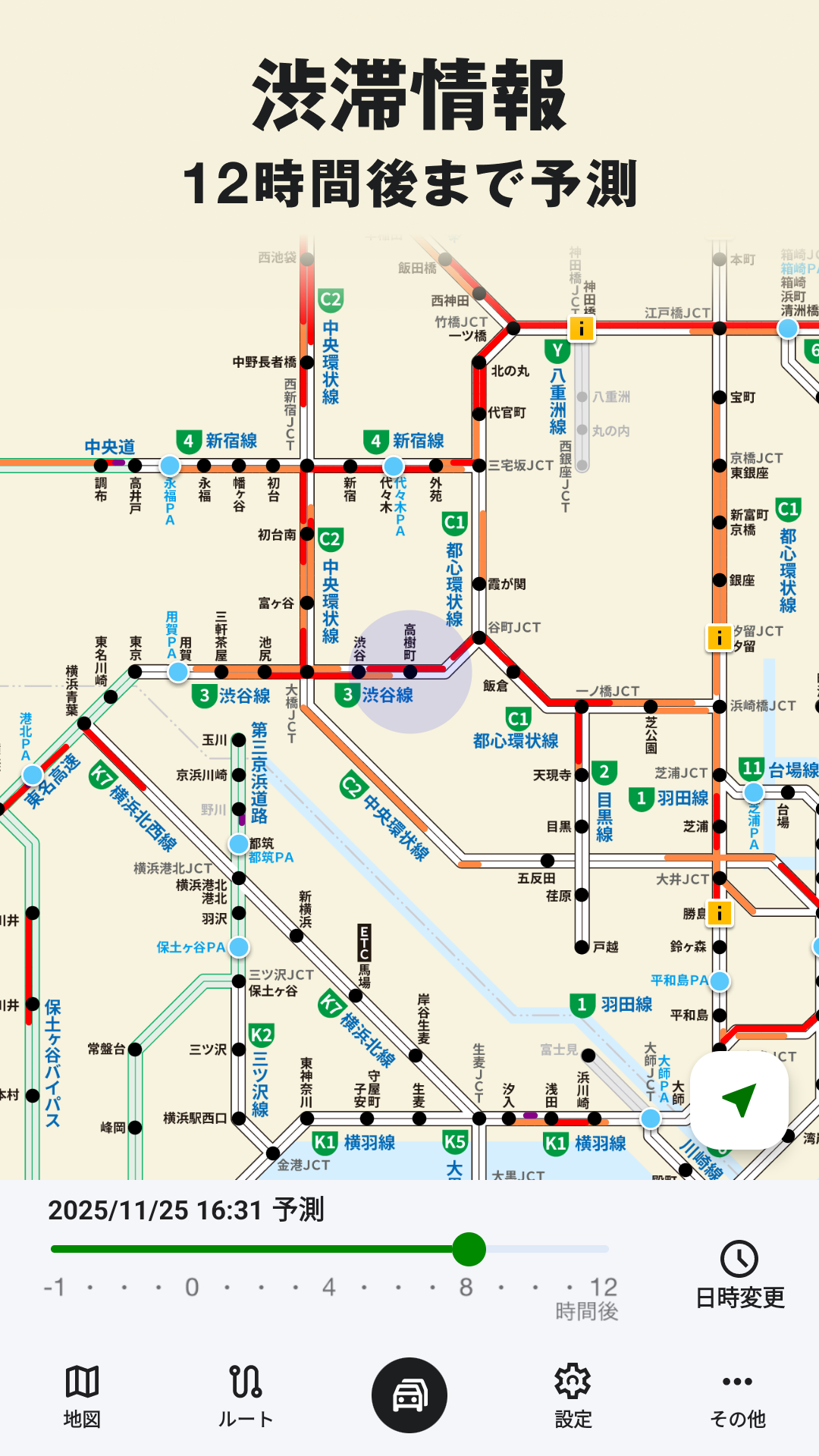 By moving the slider at the bottom of the screen, you can also check the prediction of future traffic congestion until 12 hours later. You can check the changes of traffic jams in the past, present, and future, making it easier to plan your travel. Please easily check the future traffic jam situation and use it for your transportation plan.