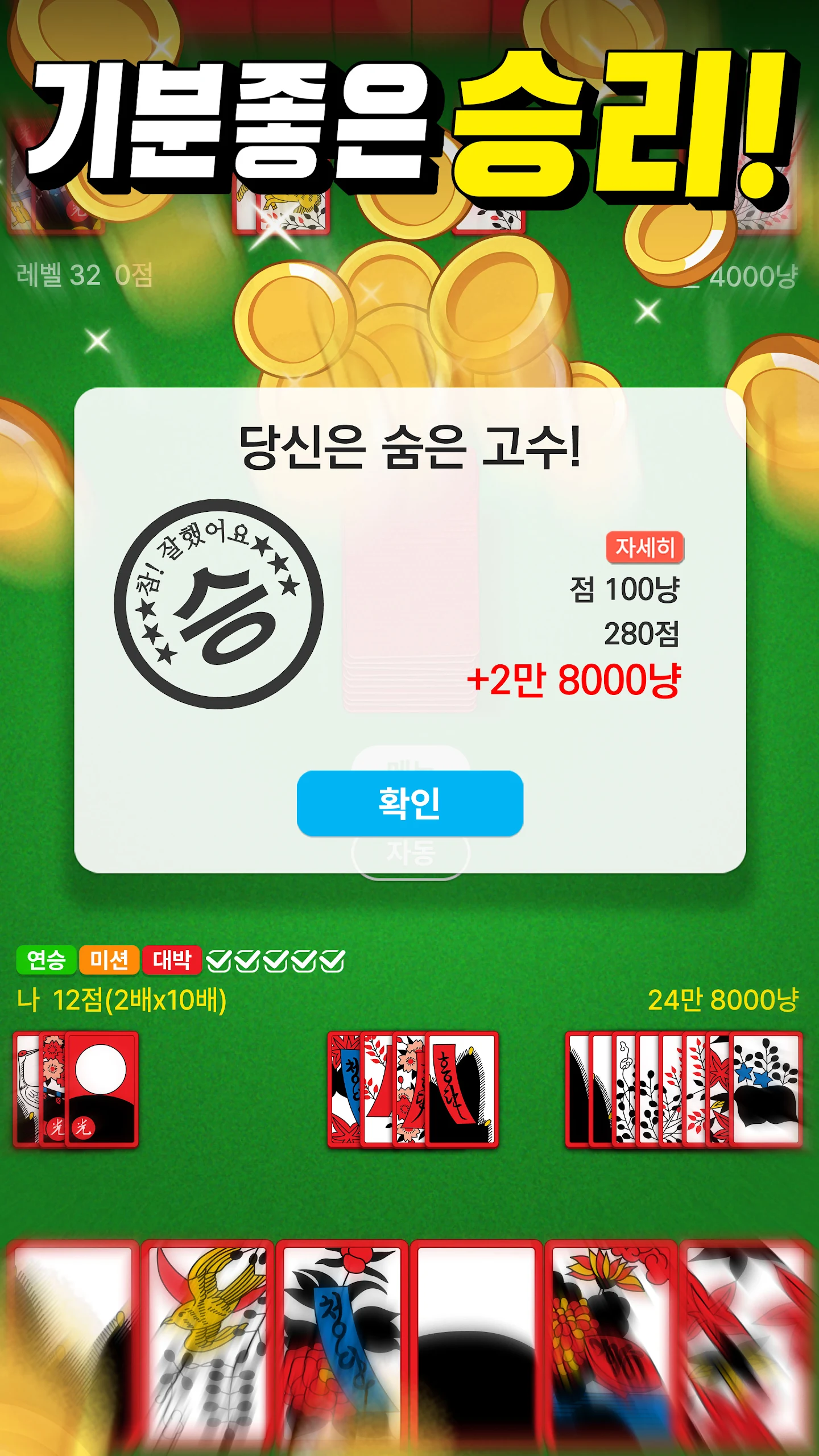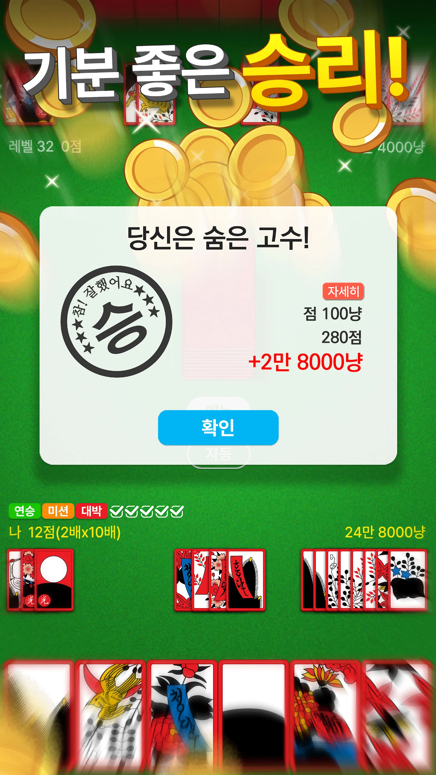 Go-Stop Plus caters to those seeking a quick and simple Go-Stop session. Enjoy seamless and neat gameplay that captures the essence of the game, including the satisfaction of placing your cards. Should you tire of playing, let the game take over for you!