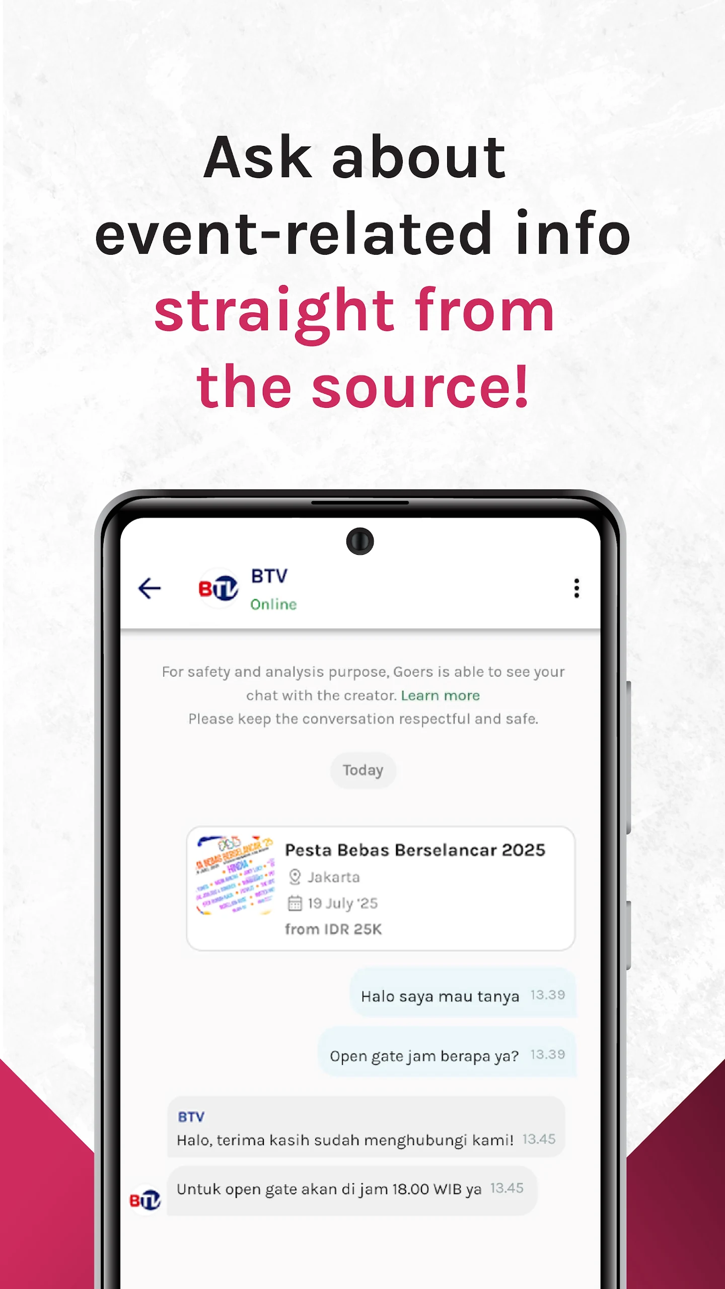 The GOERS Customer Support team is available to assist from 08:00 – 20:00 WIB, with quick response times between 2 – 5 minutes during operational hours.