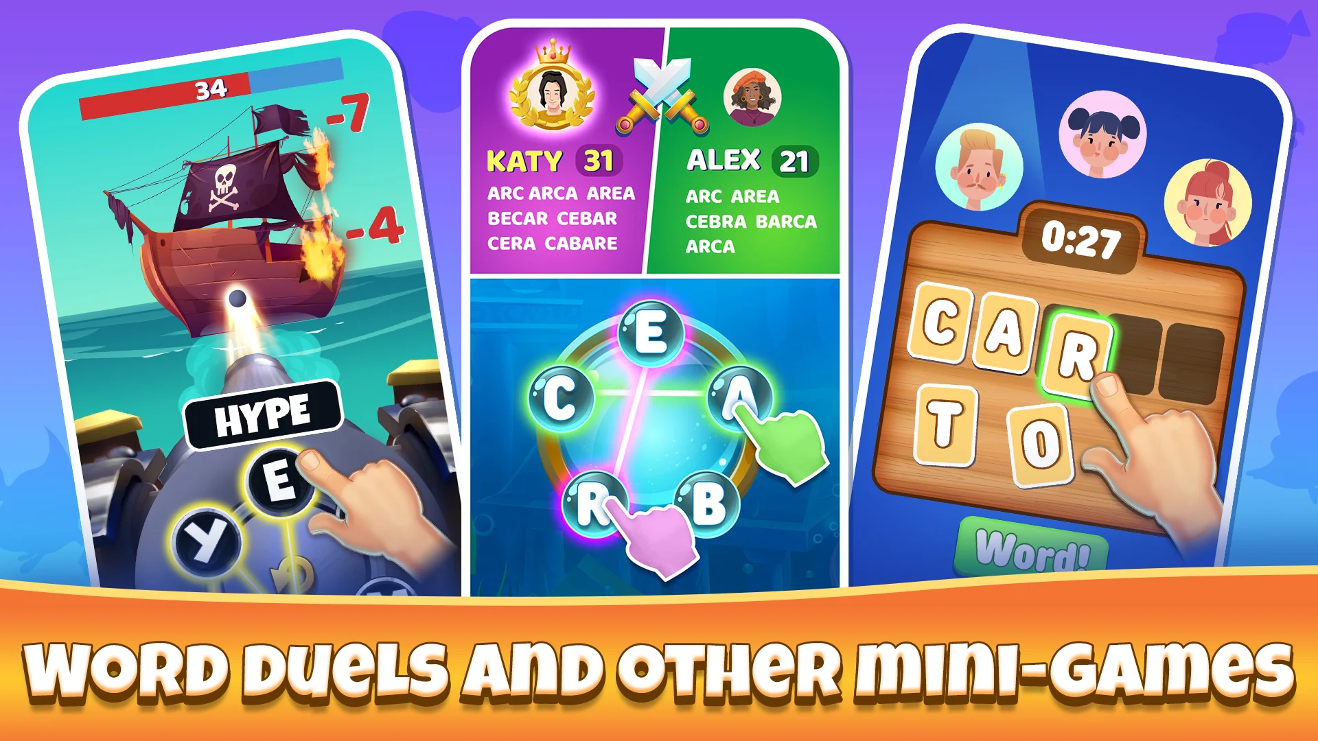 Connect letters together while enjoying interactions between players! Duel in word battles, test your language skills with the "alphabet," or chase down pirate ships using word searches! This crossword experience is more thrilling than ever with new mechanics uncommon in traditional word games.
