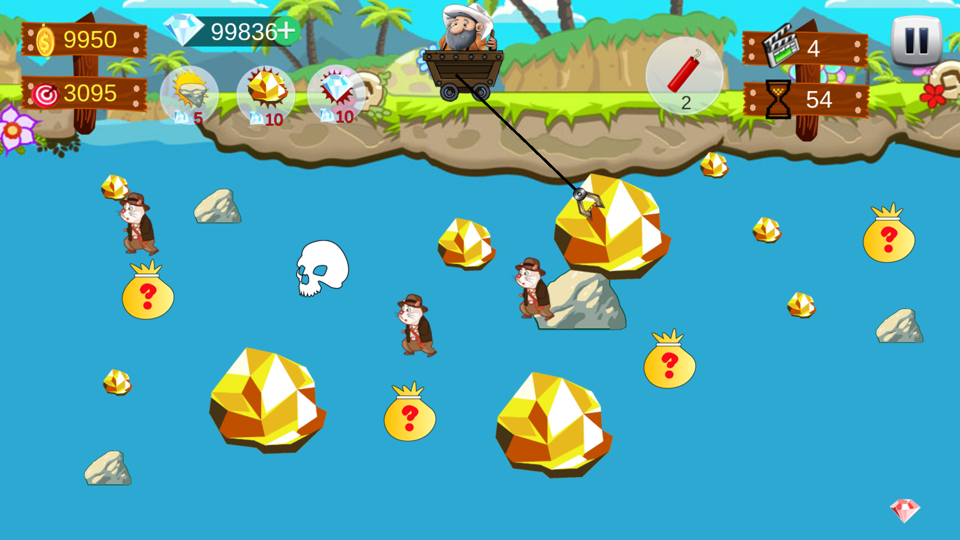 ● A wide array of enjoyable elements: different sizes of gold, diamonds, boosters for both gold and diamonds, lucky items, rock boosters, strength enhancers, timers, options to collect all gold or diamond items, destroy rock items, bombs with timers, and features for faster gameplay.