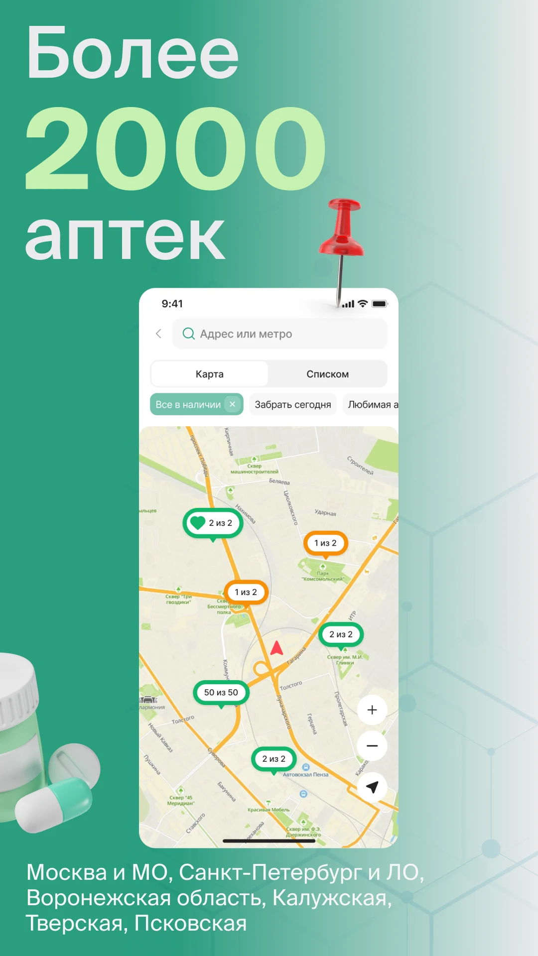 You can order medications and medical items online in Moscow, the Moscow region, St. Petersburg, as well as in Kaluga, Voronezh, Tver, Pskov, Novgorod, and other areas.