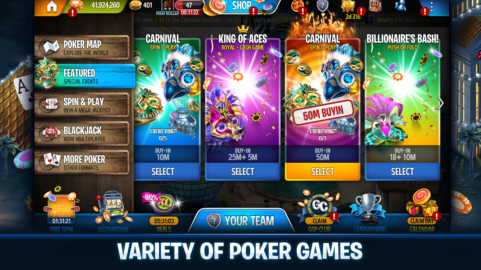 Feeling up for the challenge? Dive into free poker games and climb the ranks in the online (PvP) Poker Tournament World Leaderboard. Dominate the Blackjack tables and hit the jackpot with free spins on the bonus slot machine. A lucrative prize awaits you in our vibrant social casino featuring thrilling card games. Place your bets now and hope that fortune smiles upon you!