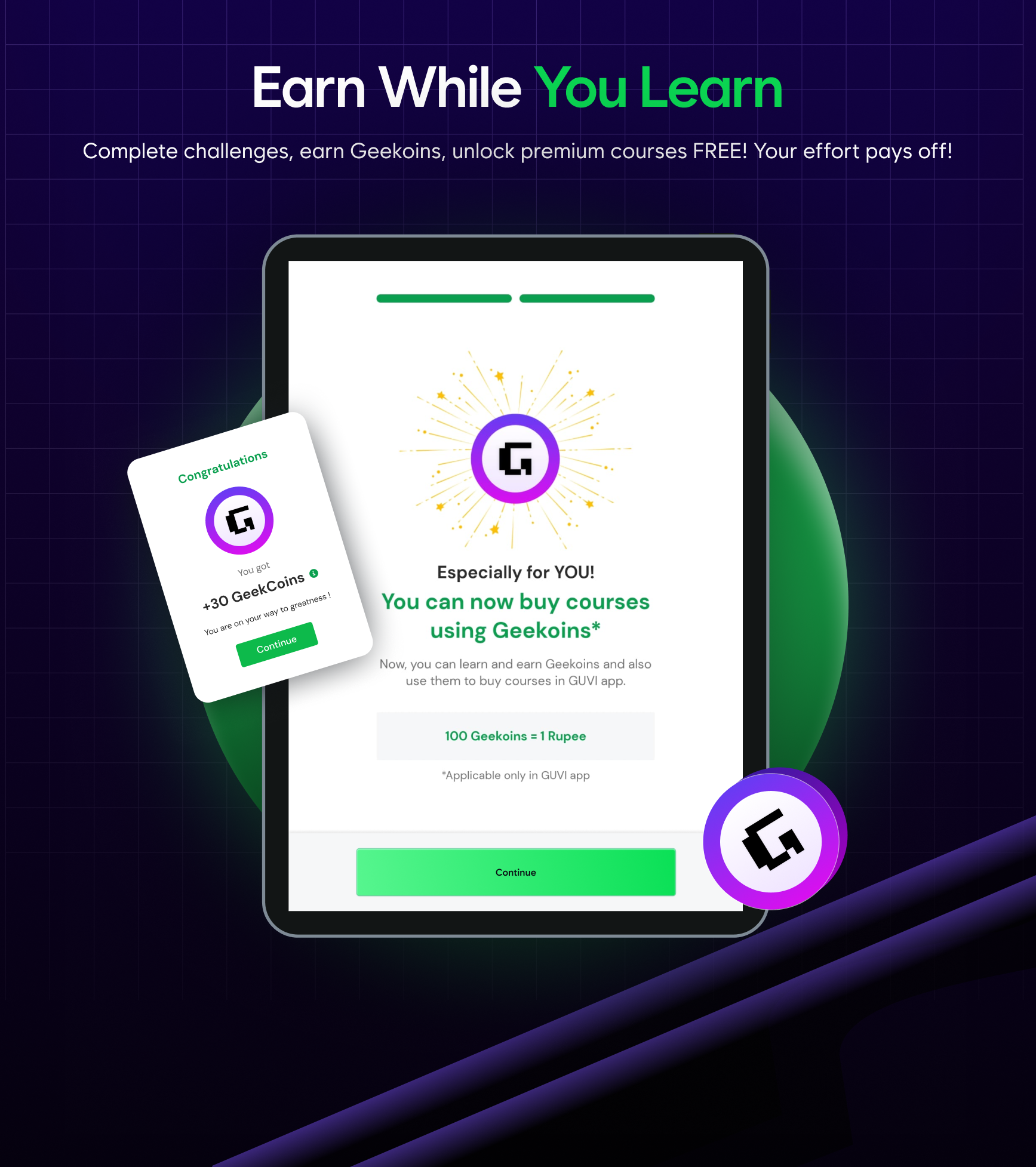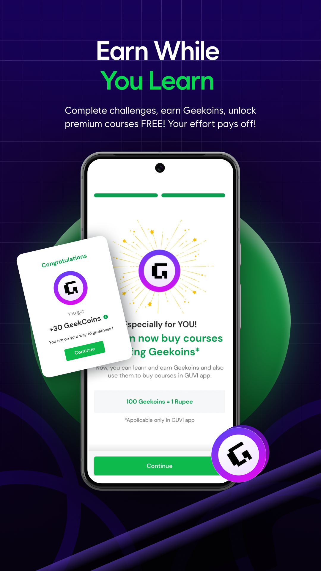 GUVI users can use GEEKOINS to purchase courses and 'run counts,' useful in CodeKata, WebKata, and Debugging, and redeem coupons from the rewards section.