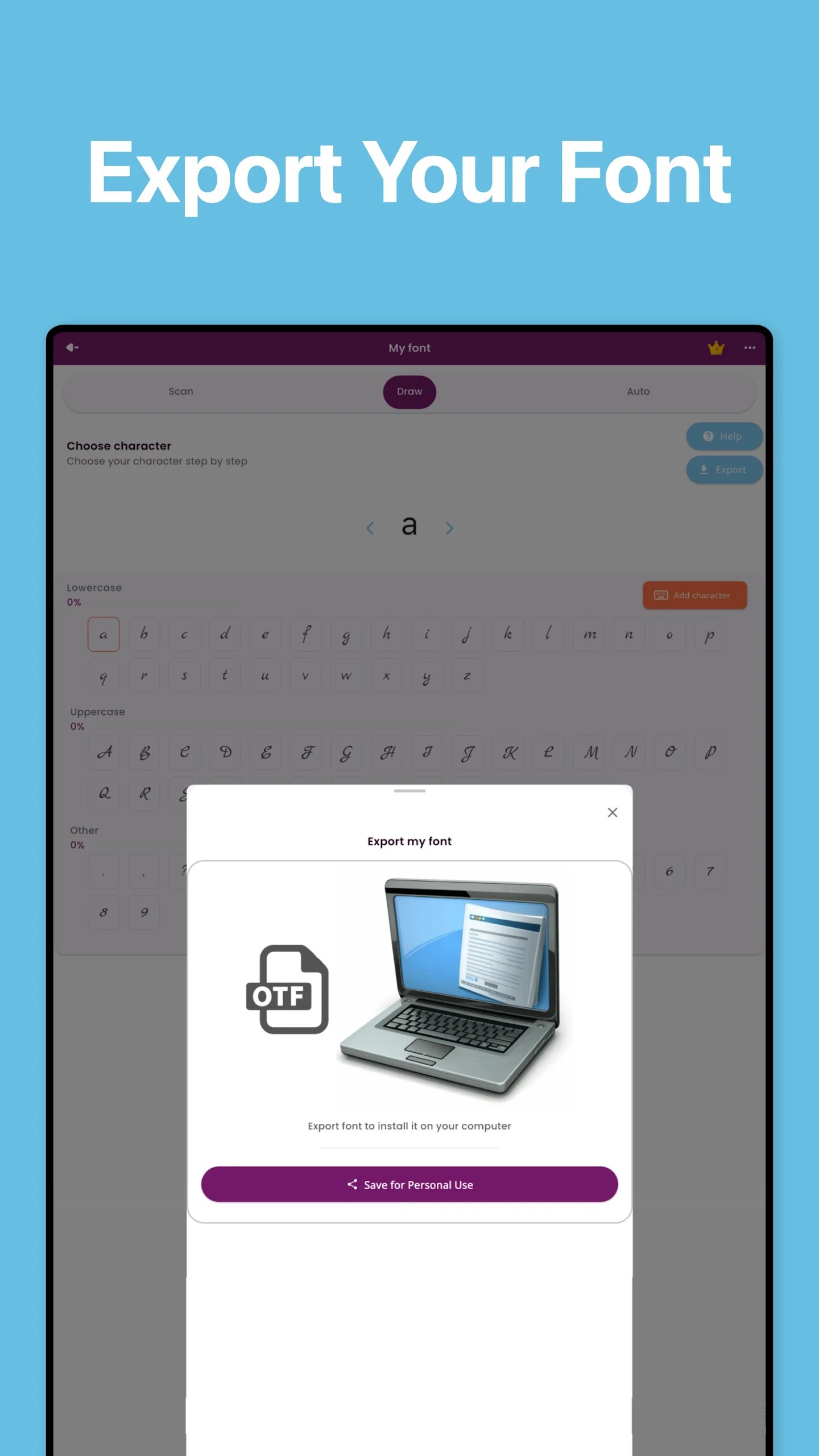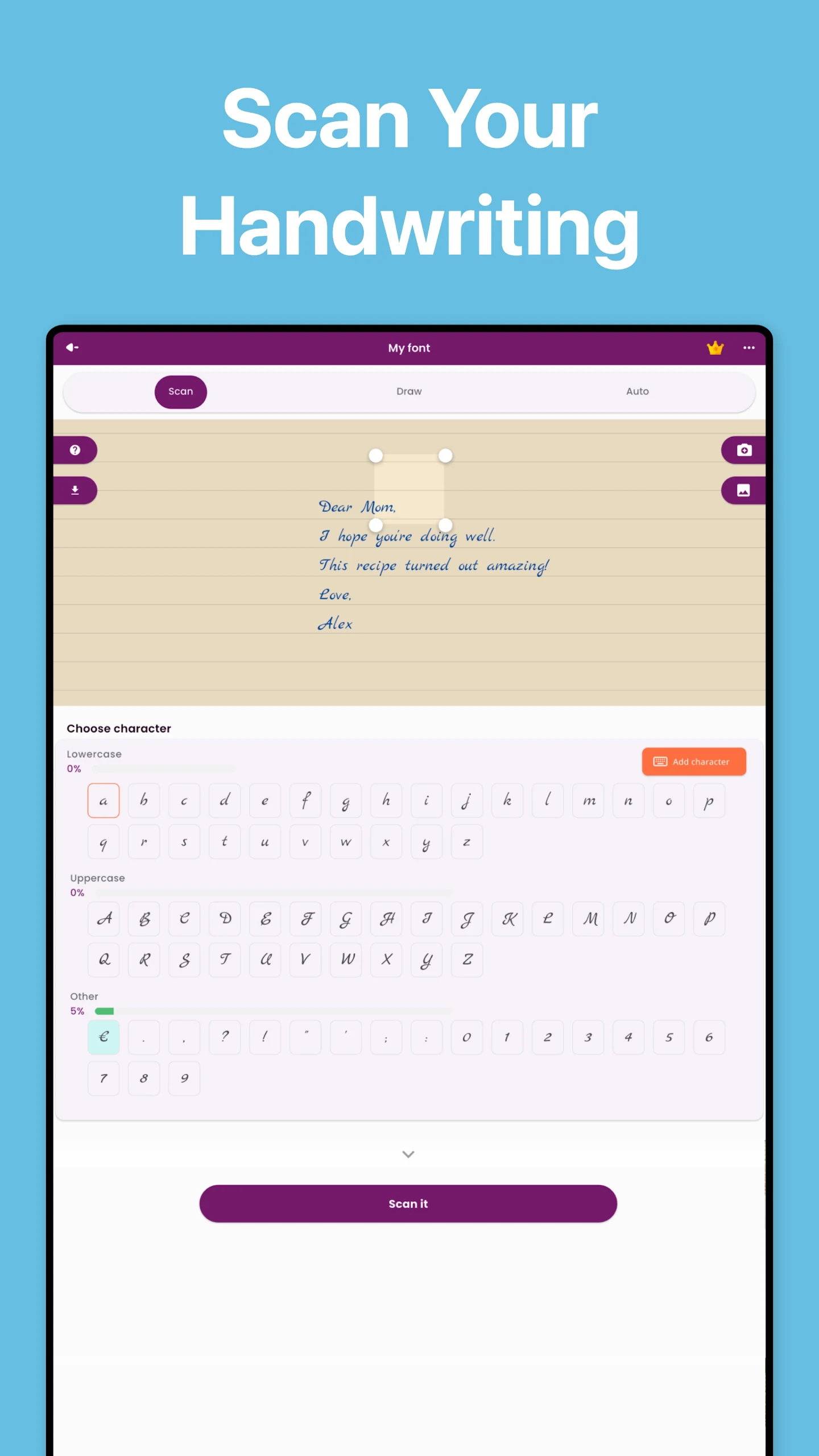 Need to write a lengthy text by hand but short on time? Give our Font Creator app a try and discover the magic! Make your work unique with your personalized font.