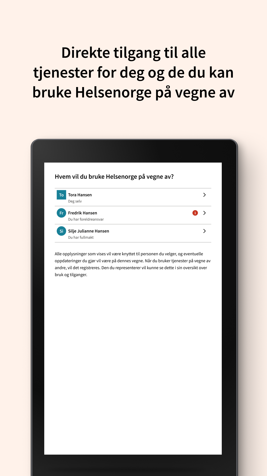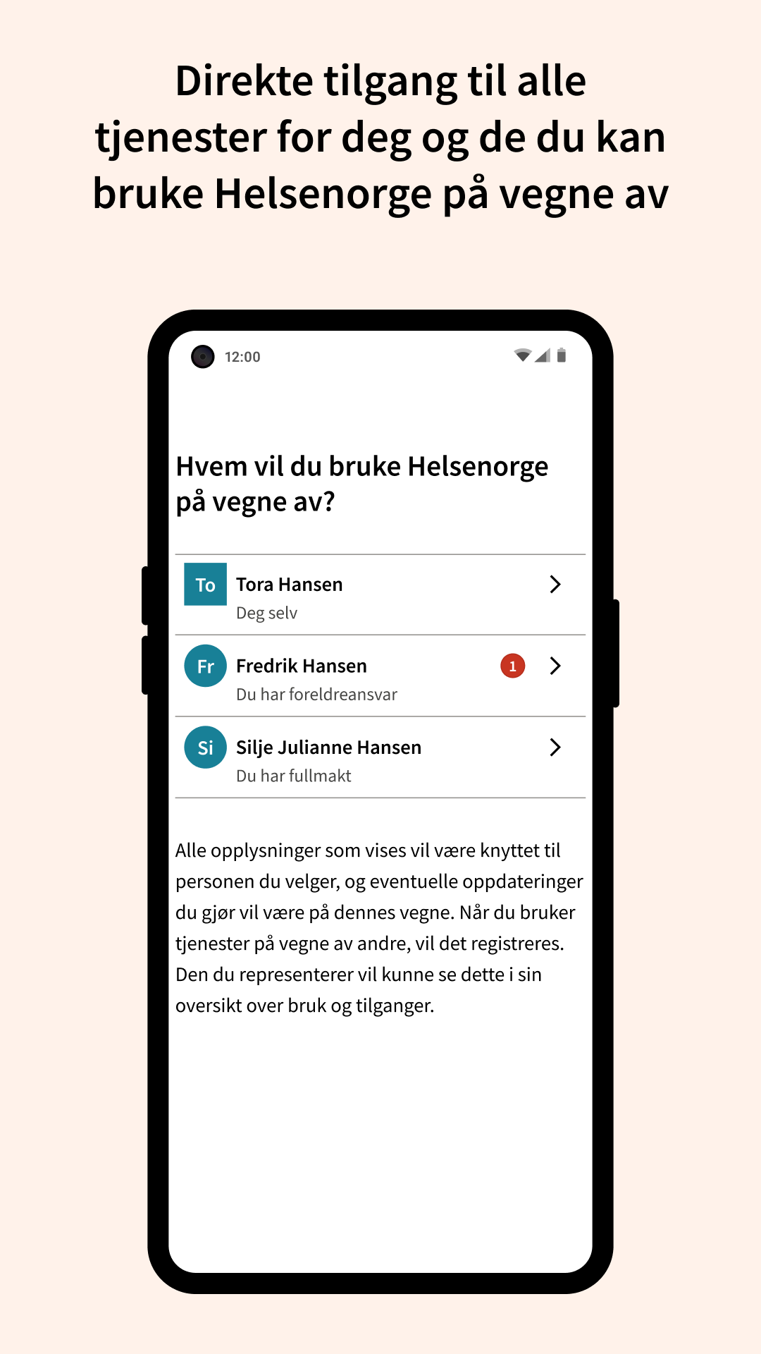 More and more people are using Health Norway, whether because they are sick and in a treatment process, are relatives, or focus on prevention to stay healthy. By accepting our terms of use, you get access to a range of self-service solutions. You can contact various healthcare providers, and you can view health information that is registered about you, your children, and others you represent with power of attorney.