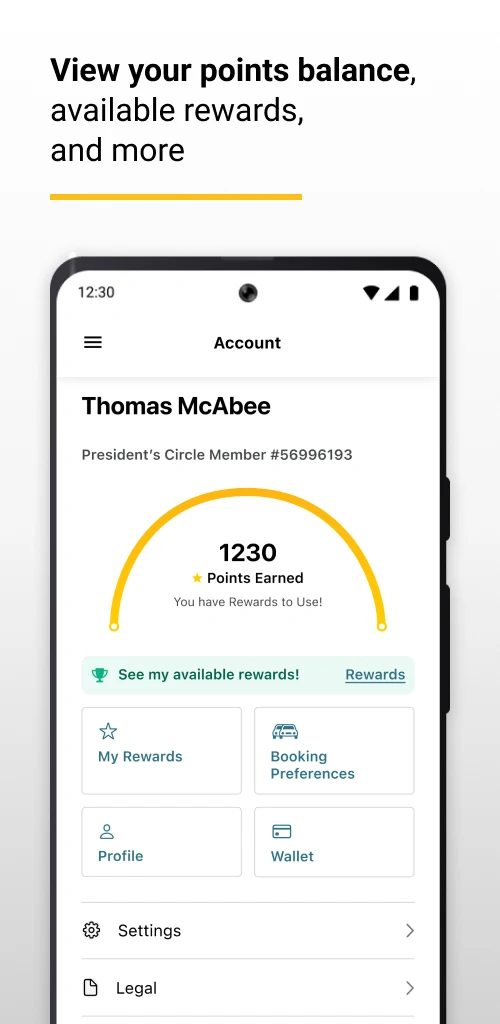 - Enjoy a personalized in-app experience showcasing your name, member number, status, and car rental rewards points balance all in one convenient spot.