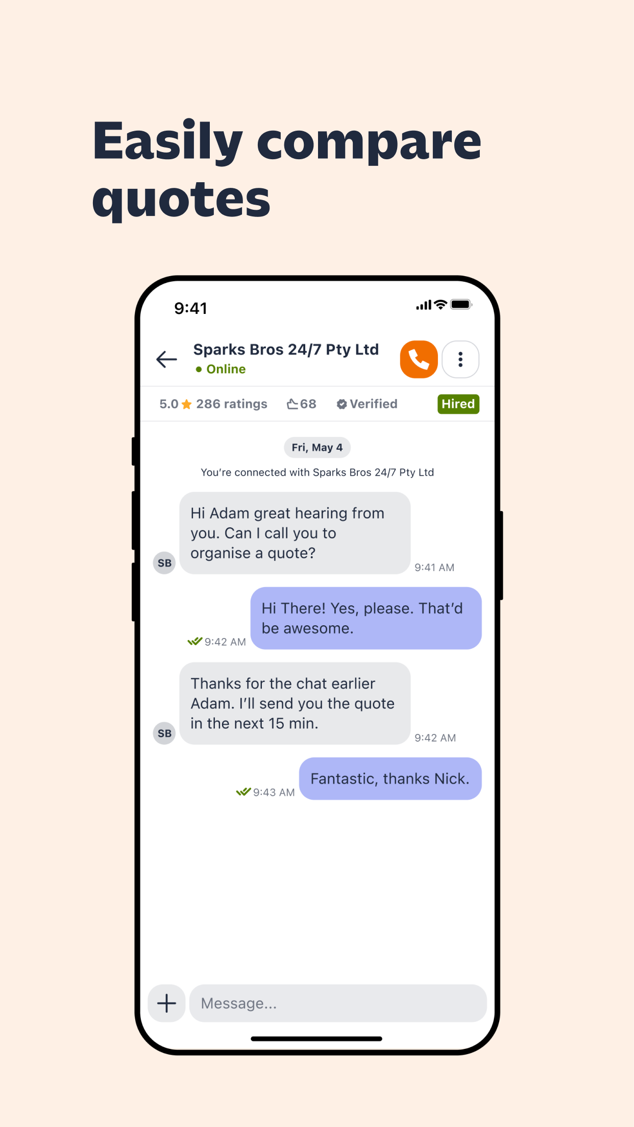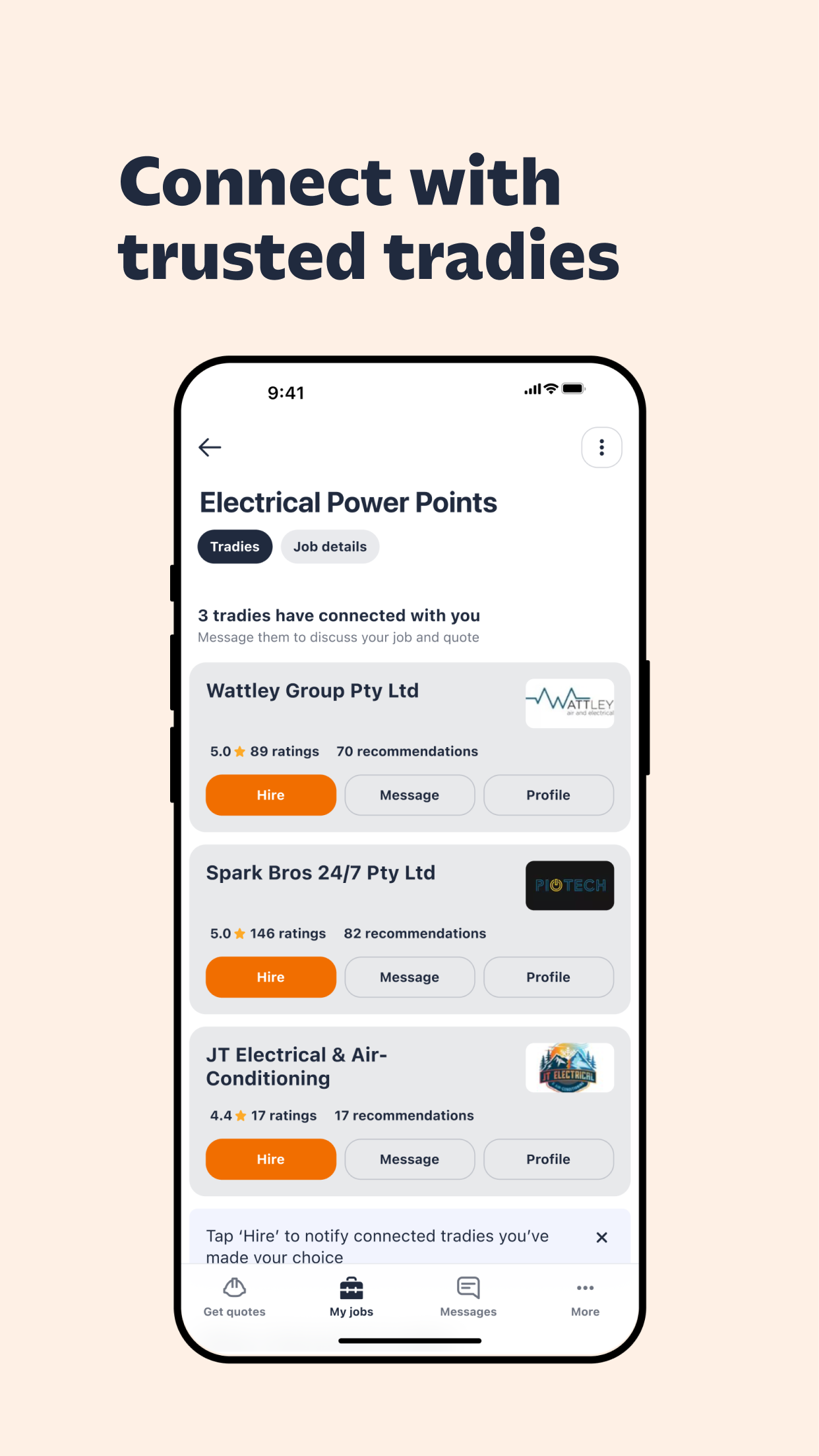 3.Evaluate & hire:Examine tradesperson profiles and ratings, compare estimates, and select the right tradesperson for your task。