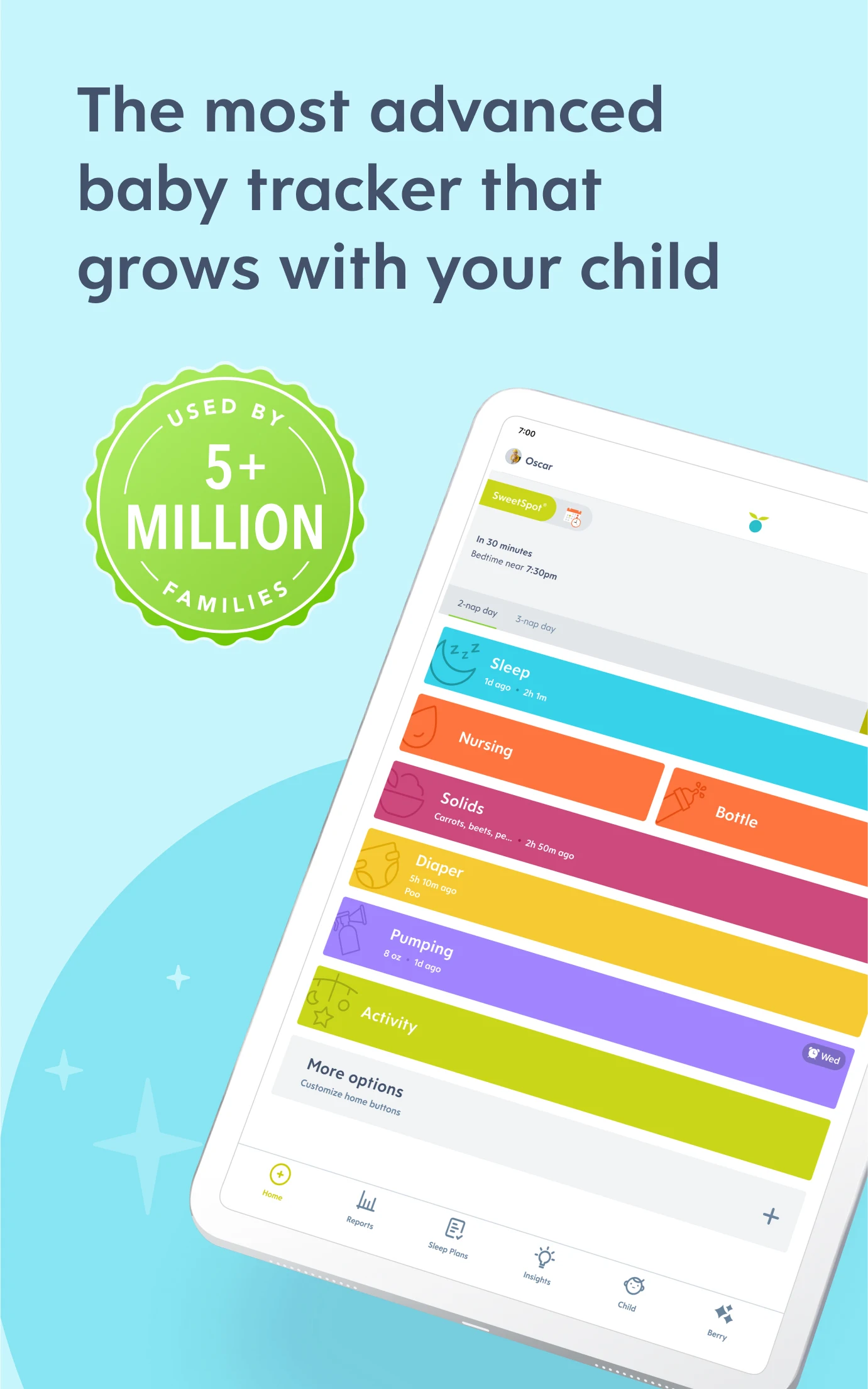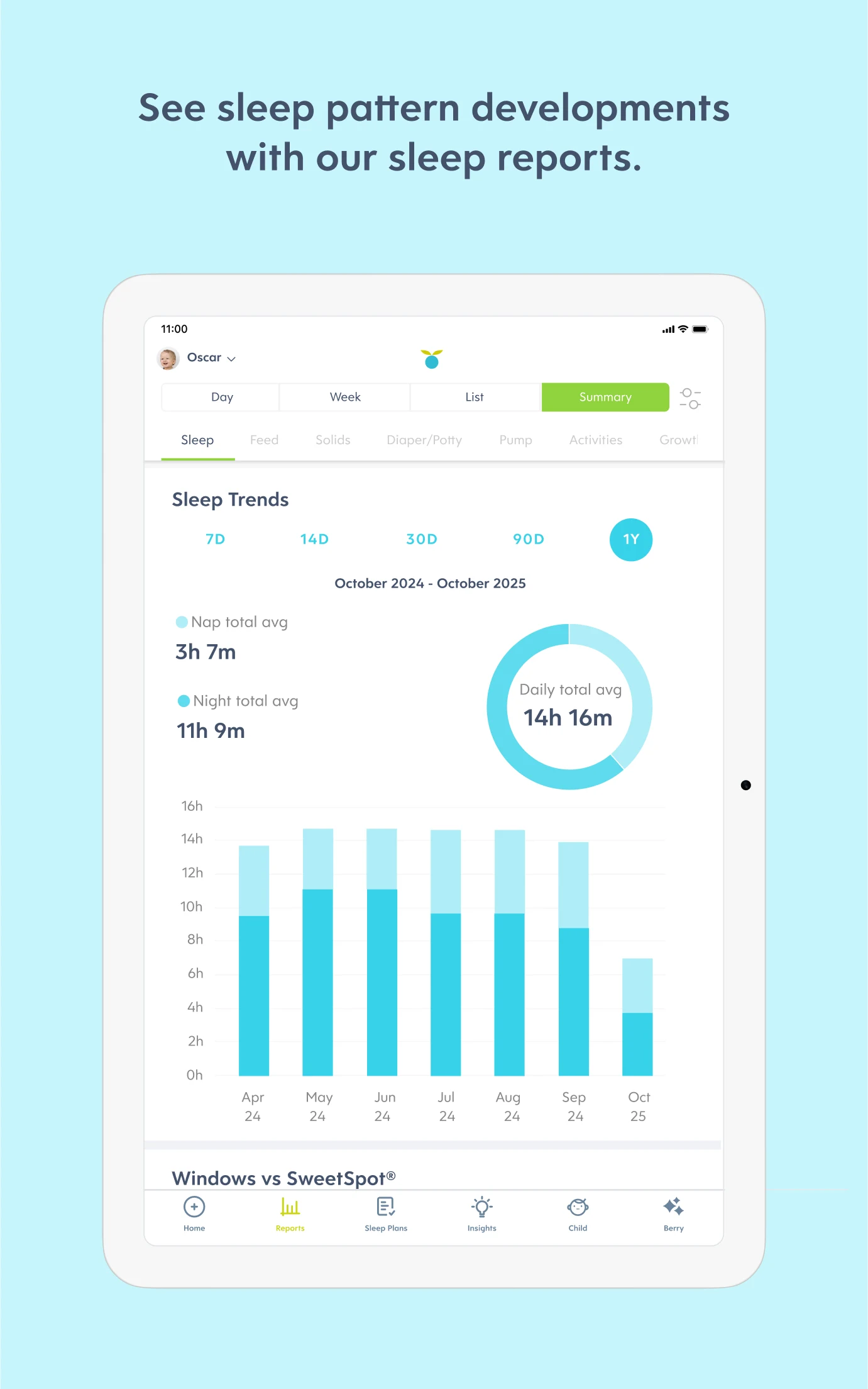 - Enhanced reports for sleep (Wake Windows vs. SweetSpot, Rise and Bedtime) and solids (Allergens and Sensitivities).