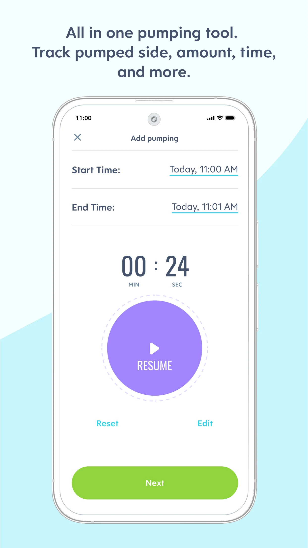 - Pumping tracker, with reminders, to track total amount and log output from each side.