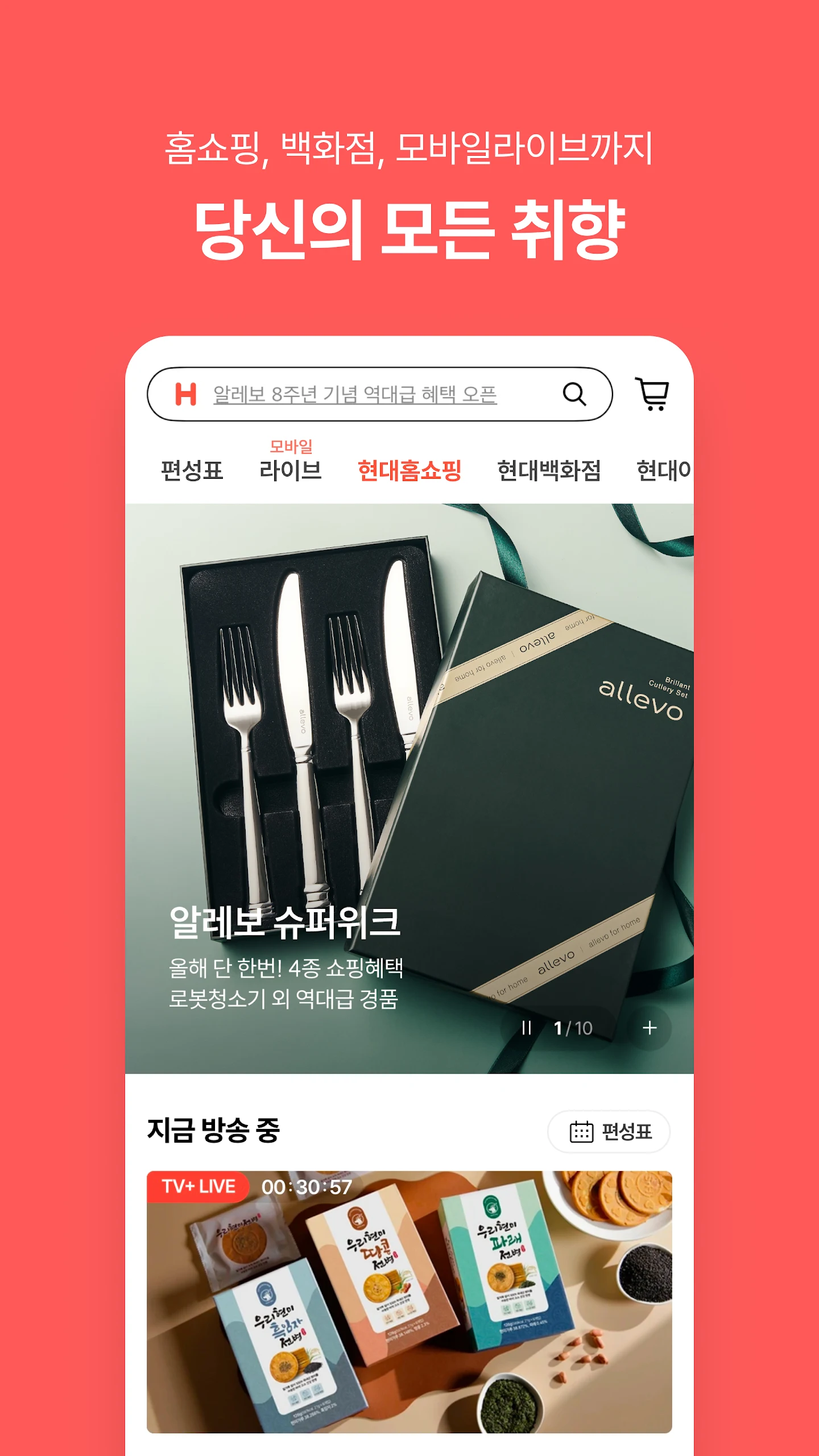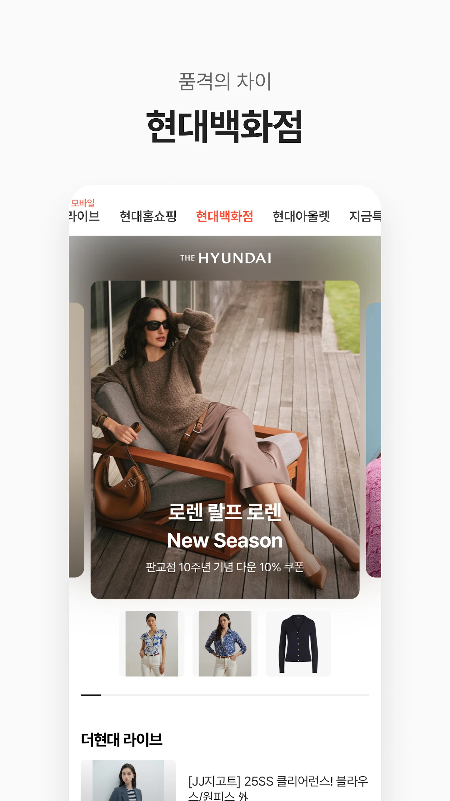 A mobile application that combines the services of Hyundai Department Store and Hyundai Home Shopping.
