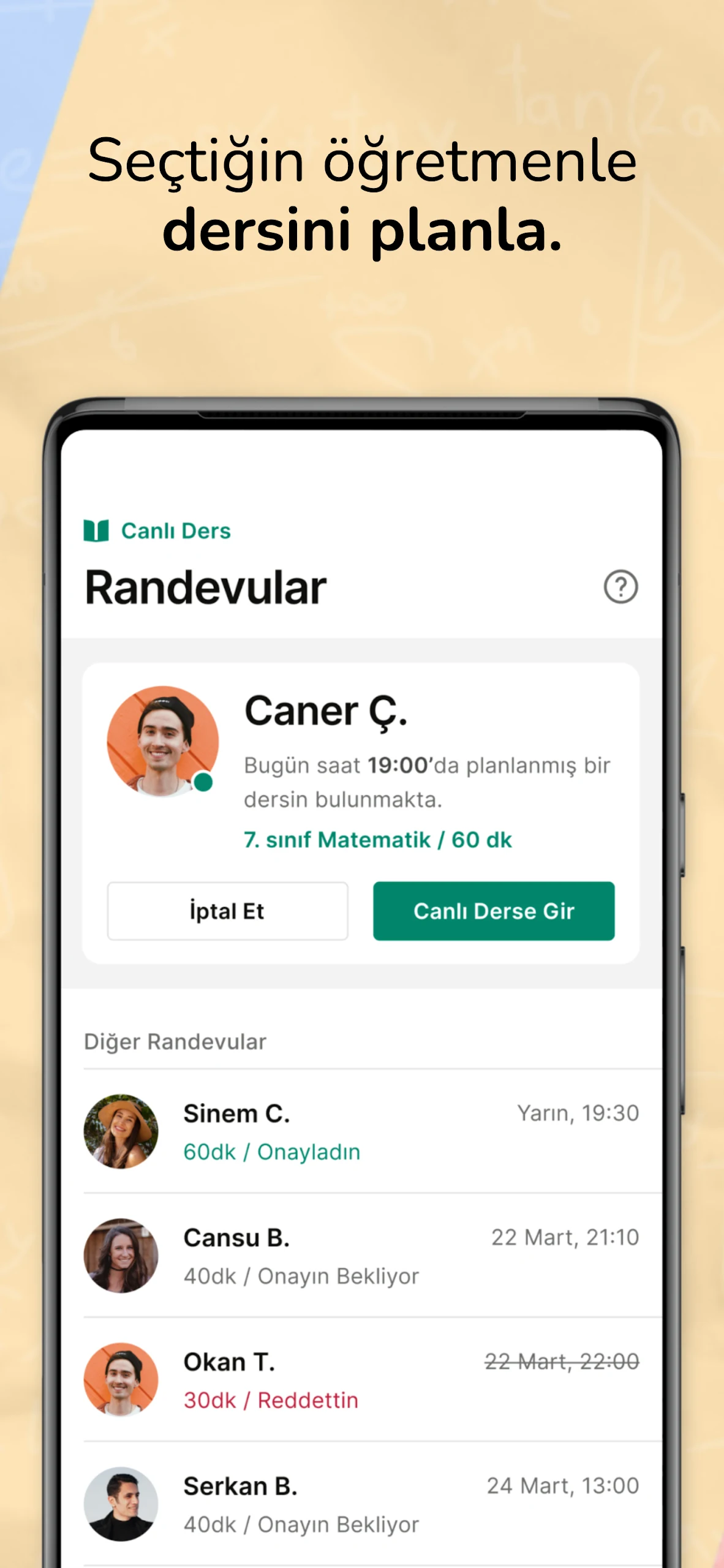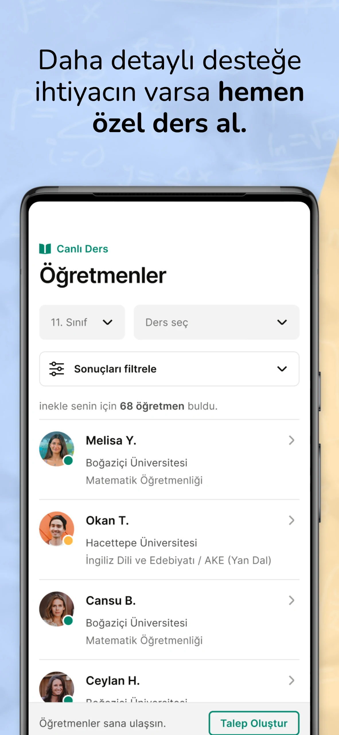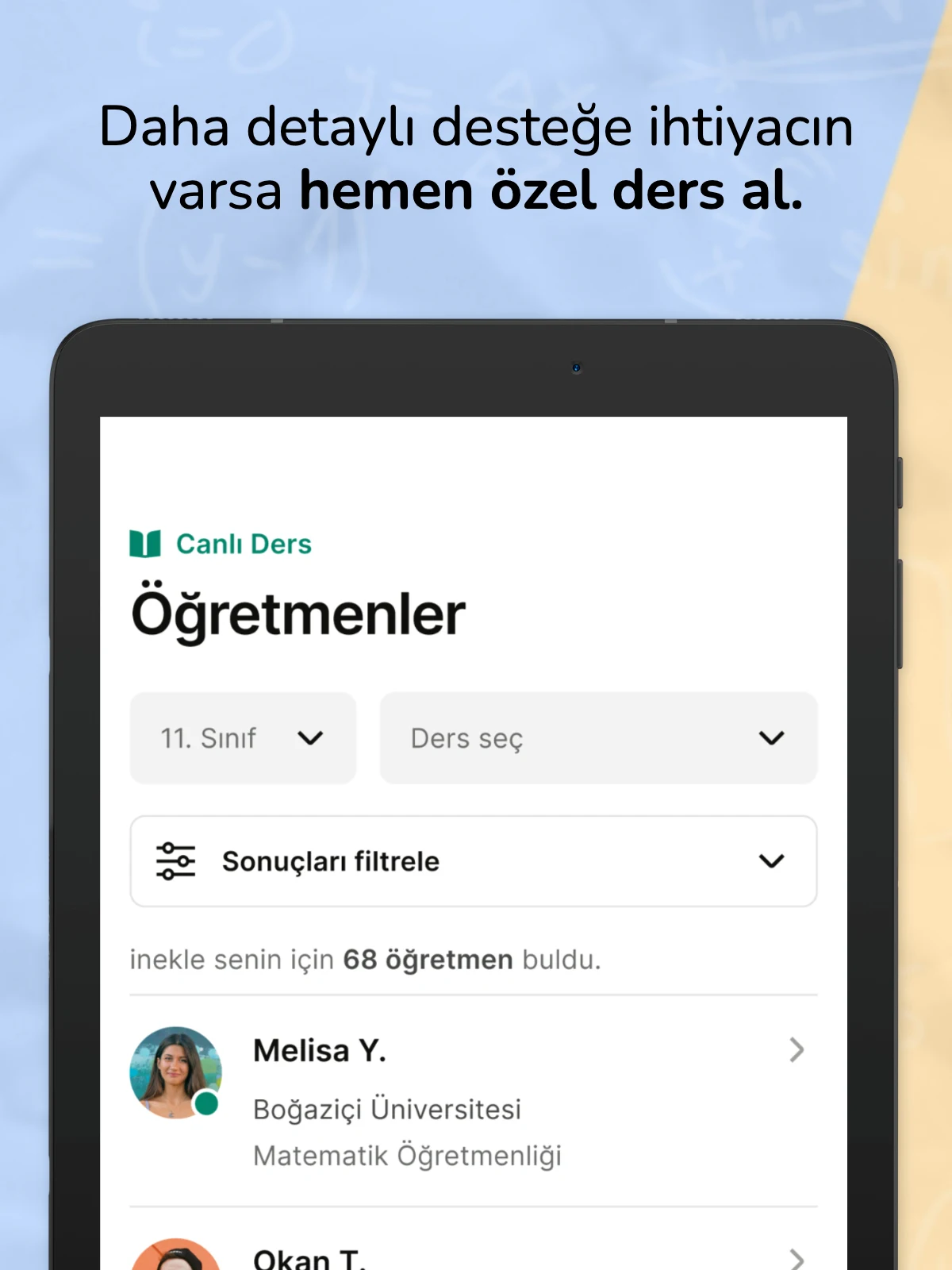 Our educators are carefully chosen from top-performing young individuals studying at prestigious universities in Turkey. Using a peer education model, inekle emphasizes a friendly, clear, efficient, and enjoyable tutoring experience. The university students teaching through inekle are vital components of this learning approach. Should you encounter topics you find difficult, you can directly message your instructor to arrange a one-on-one lesson for complete understanding.
