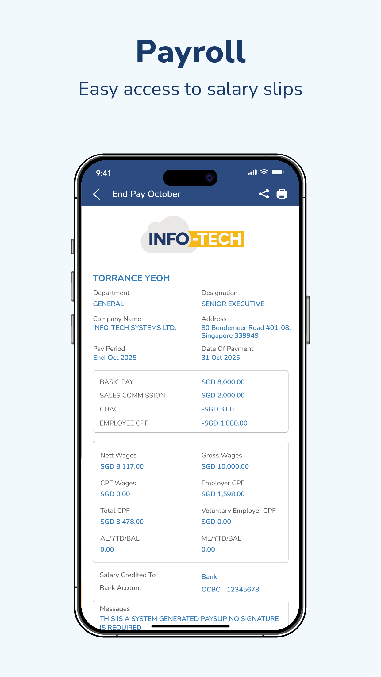 Employees have access to their payslips from the previous month. They can choose to print them directly or share them securely through messaging platforms for purposes such as applying for bank loans.