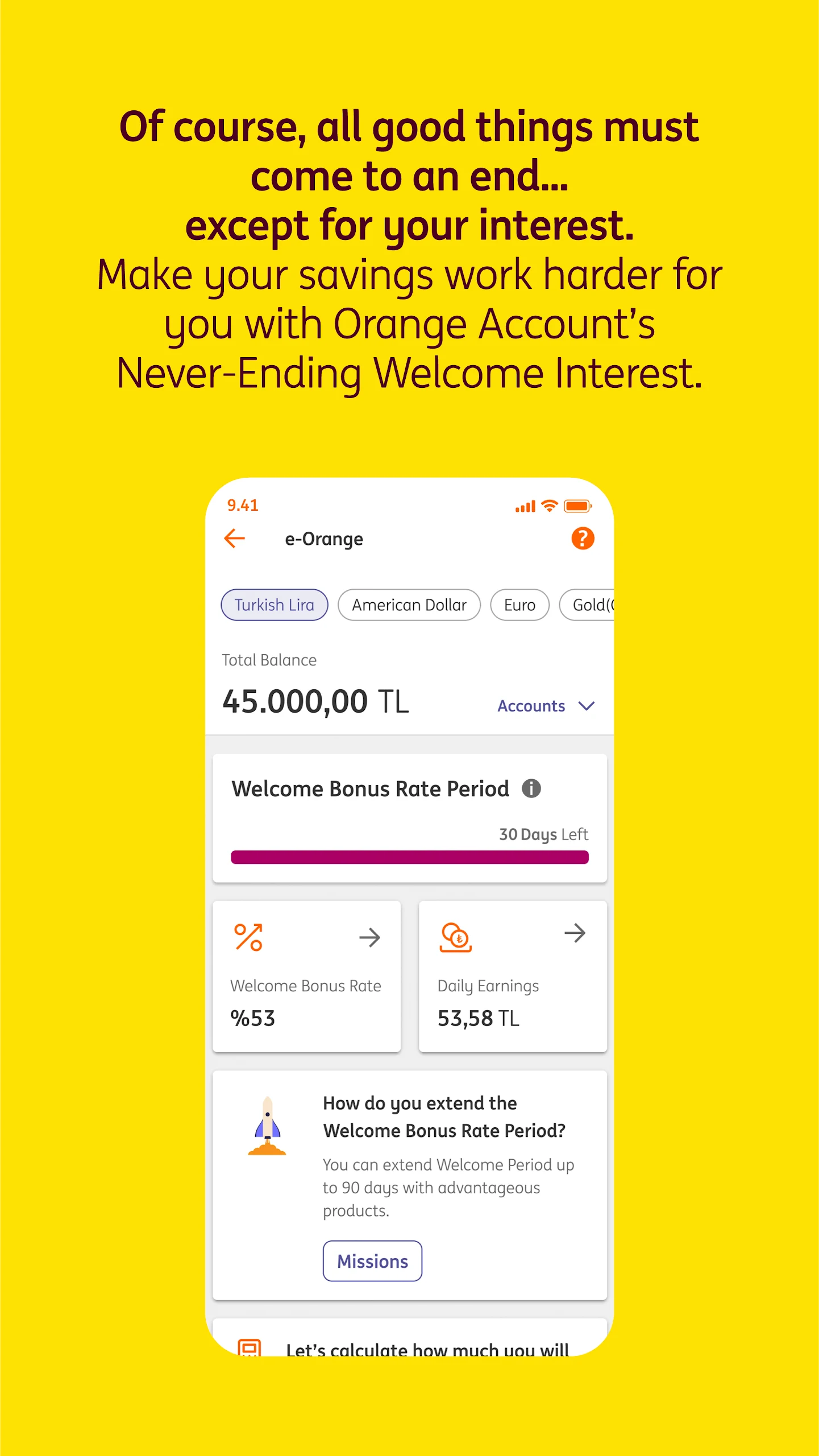 - Open an e-Orange Account, monitor savings with attractive deposit rates, and track daily earnings.