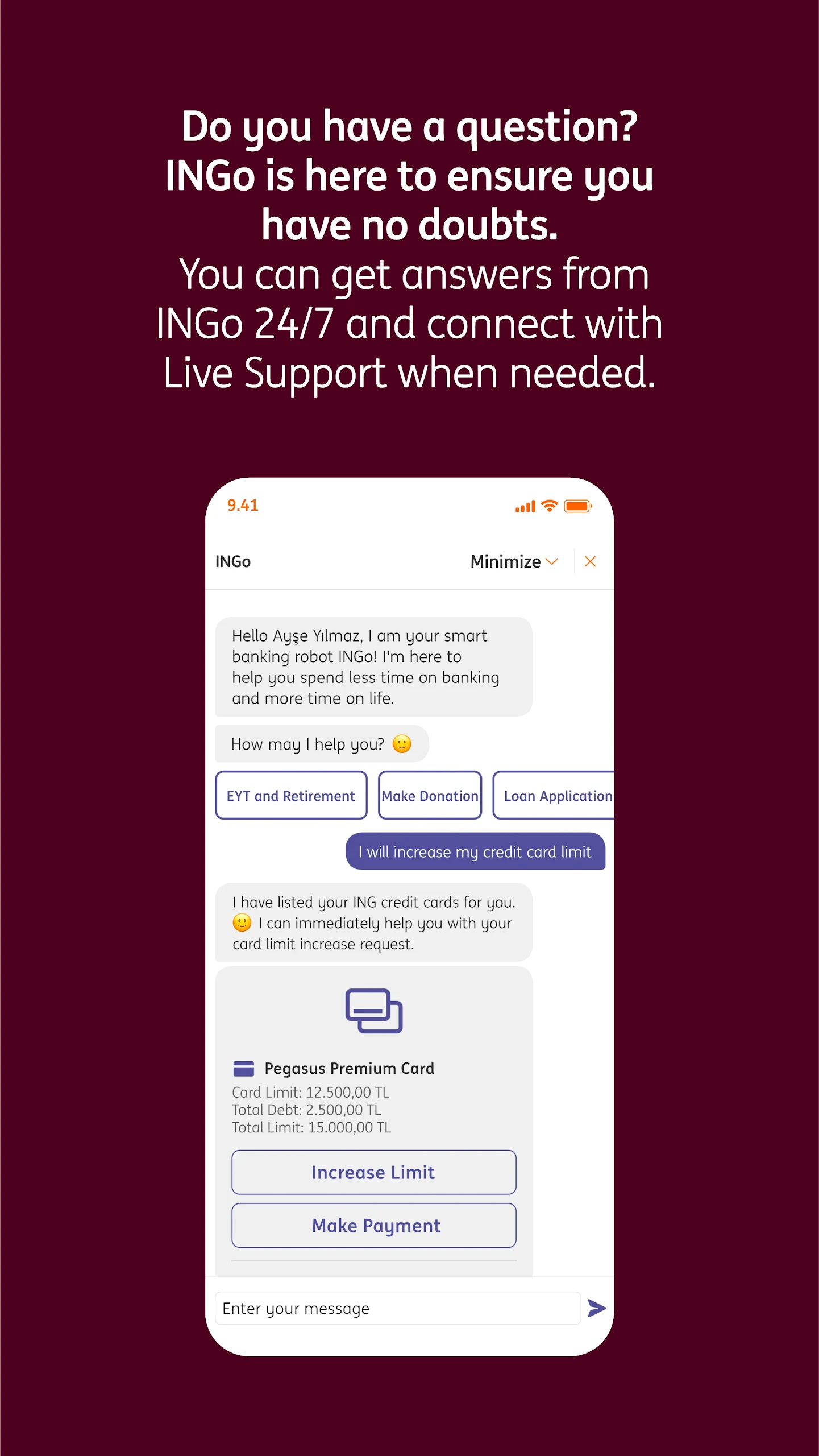 - Seek assistance from the intelligent banking chatbot INGo 24/7 for queries on banking products or transactions, with instant responses. Additionally, INGo can connect you to Live Chat support whenever required.
