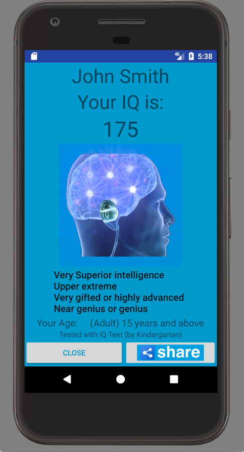 The IQ tester app includes a feature for taking selfies and entering your name before sharing results with friends, making it easy to show off your “What’s my IQ” status.