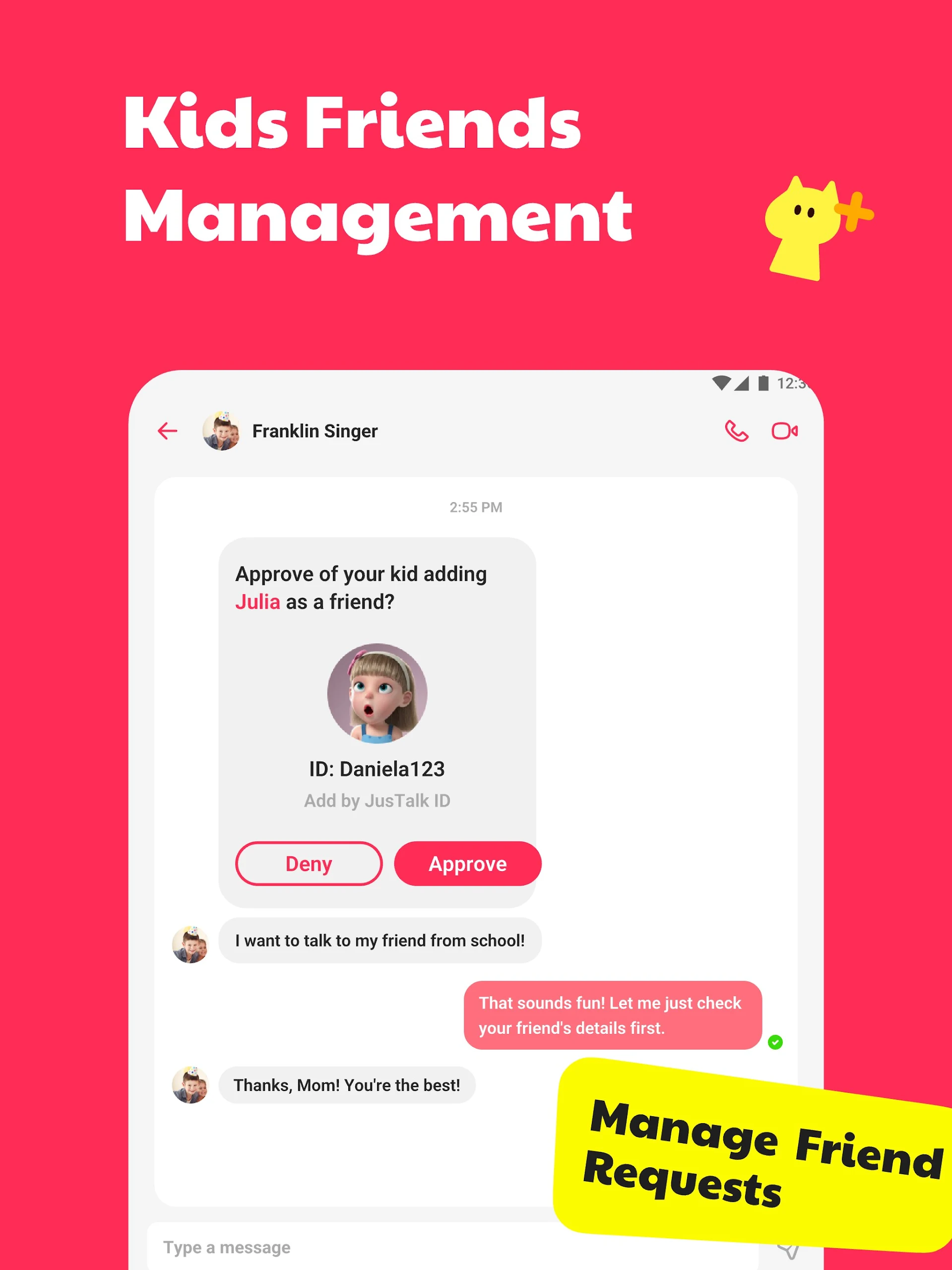 JusTalk Kids strictly protects each child's personal information, ensuring their privacy is not violated or abused. It provides compelling parental management features, allowing busy parents or concerned guardians to actively manage their child's usage within JusTalk Kids and keep them informed about their child's behavior in the app.