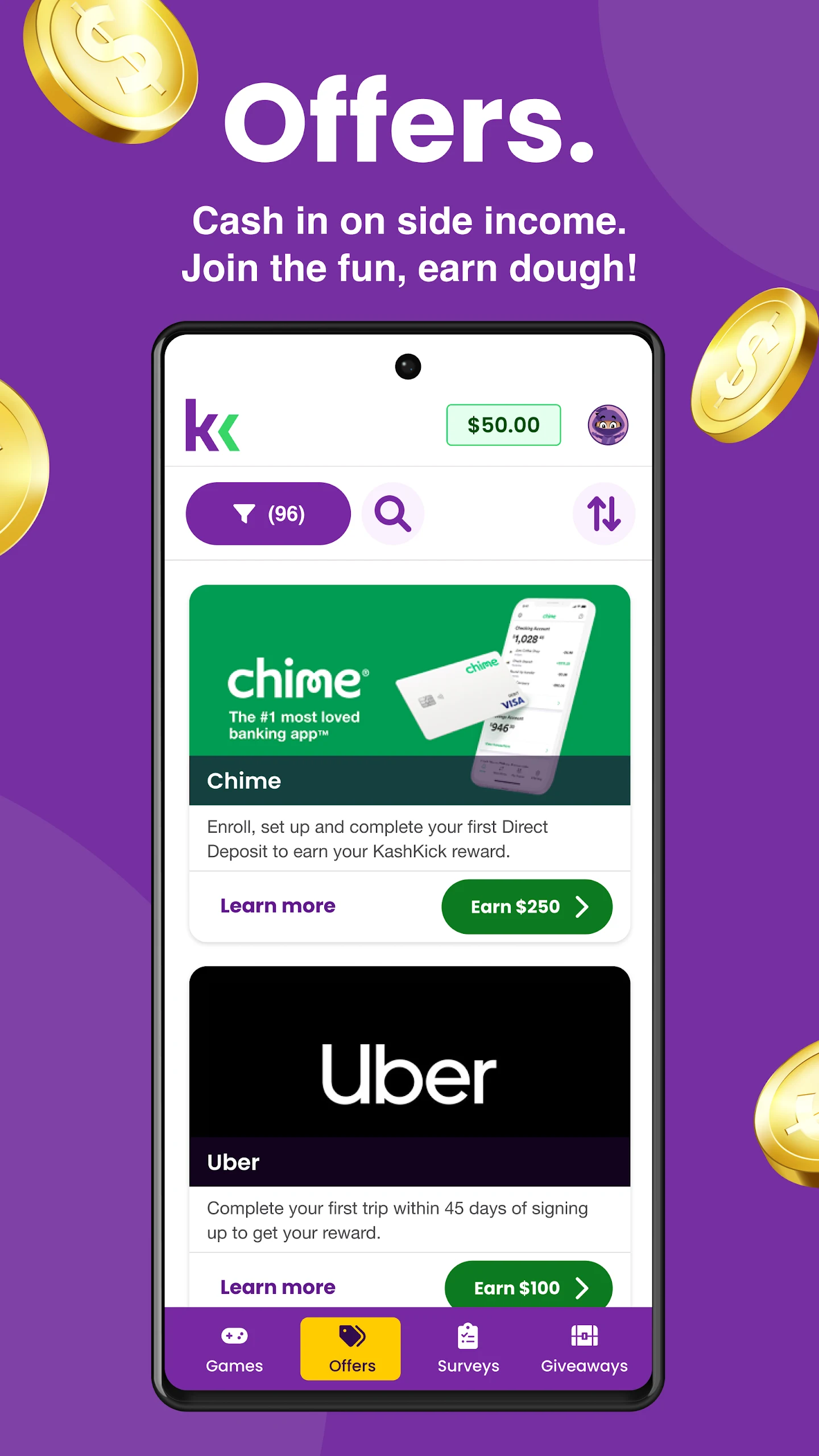 Join a community of over 2 million successful members who have collectively earned countless rewards! KashKick is a rewards platform that provides enjoyable and flexible opportunities to make money through popular games, paid surveys, exclusive offers, and more. With KashKick, you'll find an easy path to earning—no hidden tricks or complicated rules—just straightforward rewards for engaging in activities you enjoy.