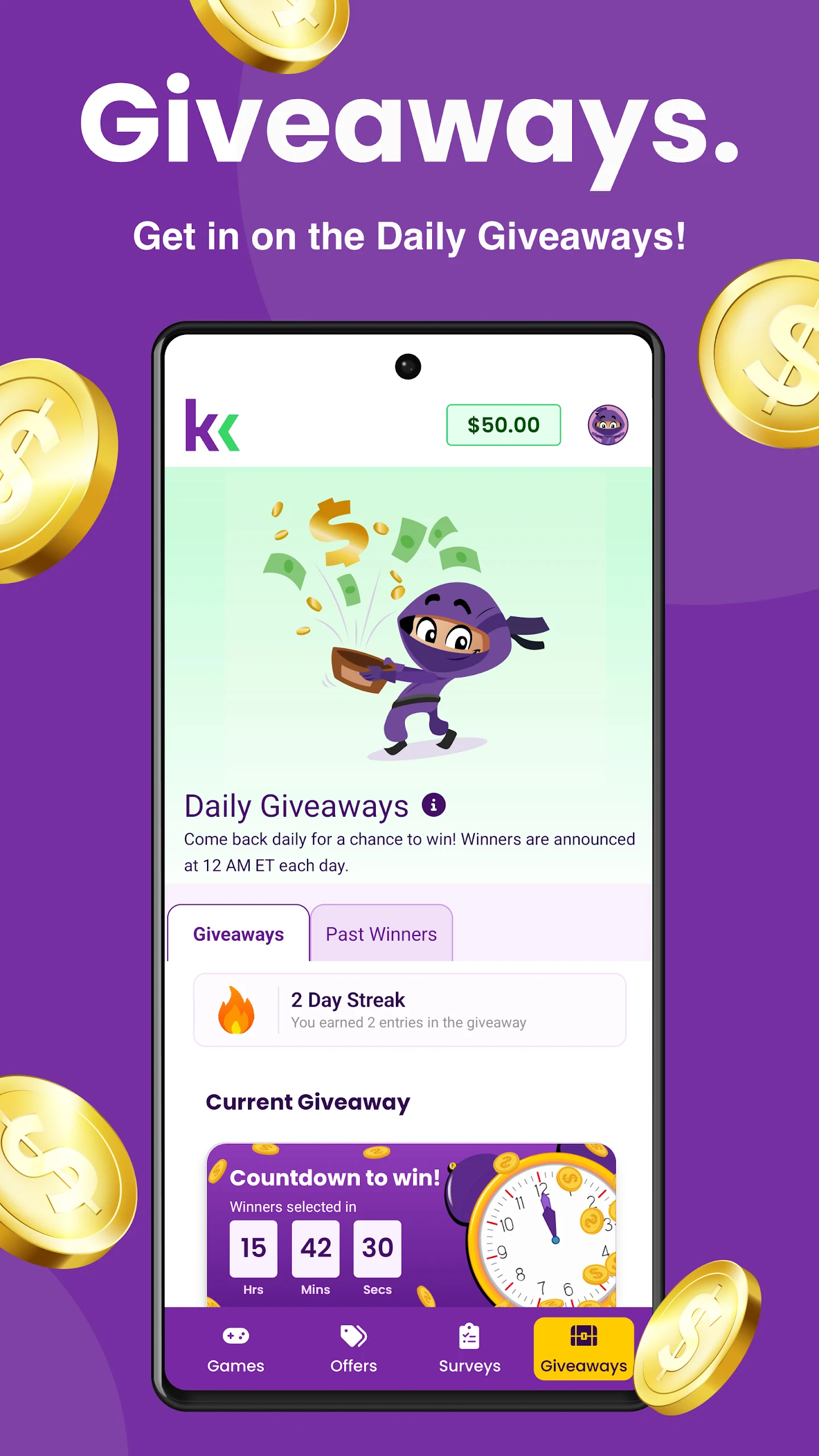Win up to $100 in our Daily Giveaway simply by logging into your KashKick account. Increase your chances by building your login streak; each consecutive day you log in grants you an additional entry and heightens your odds of winning.