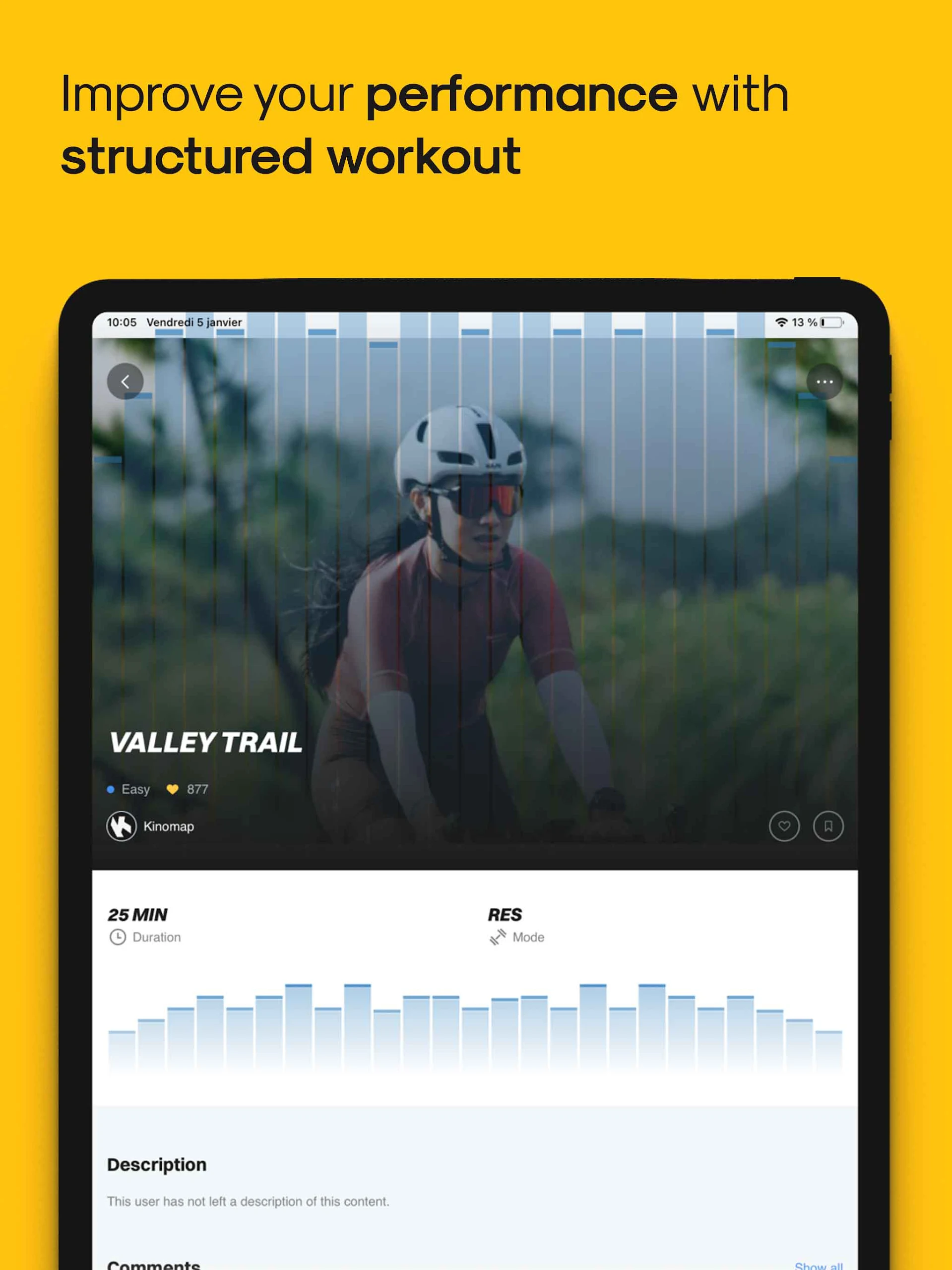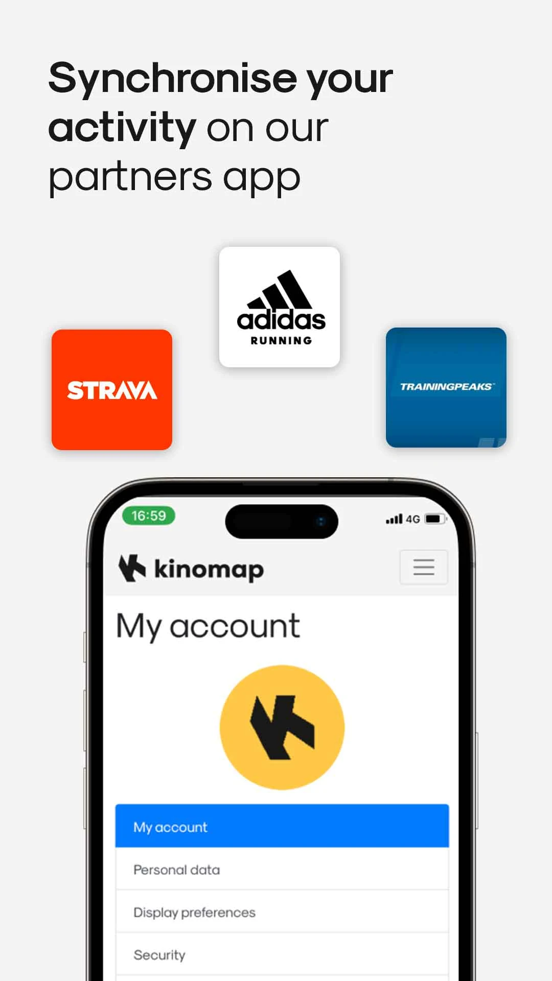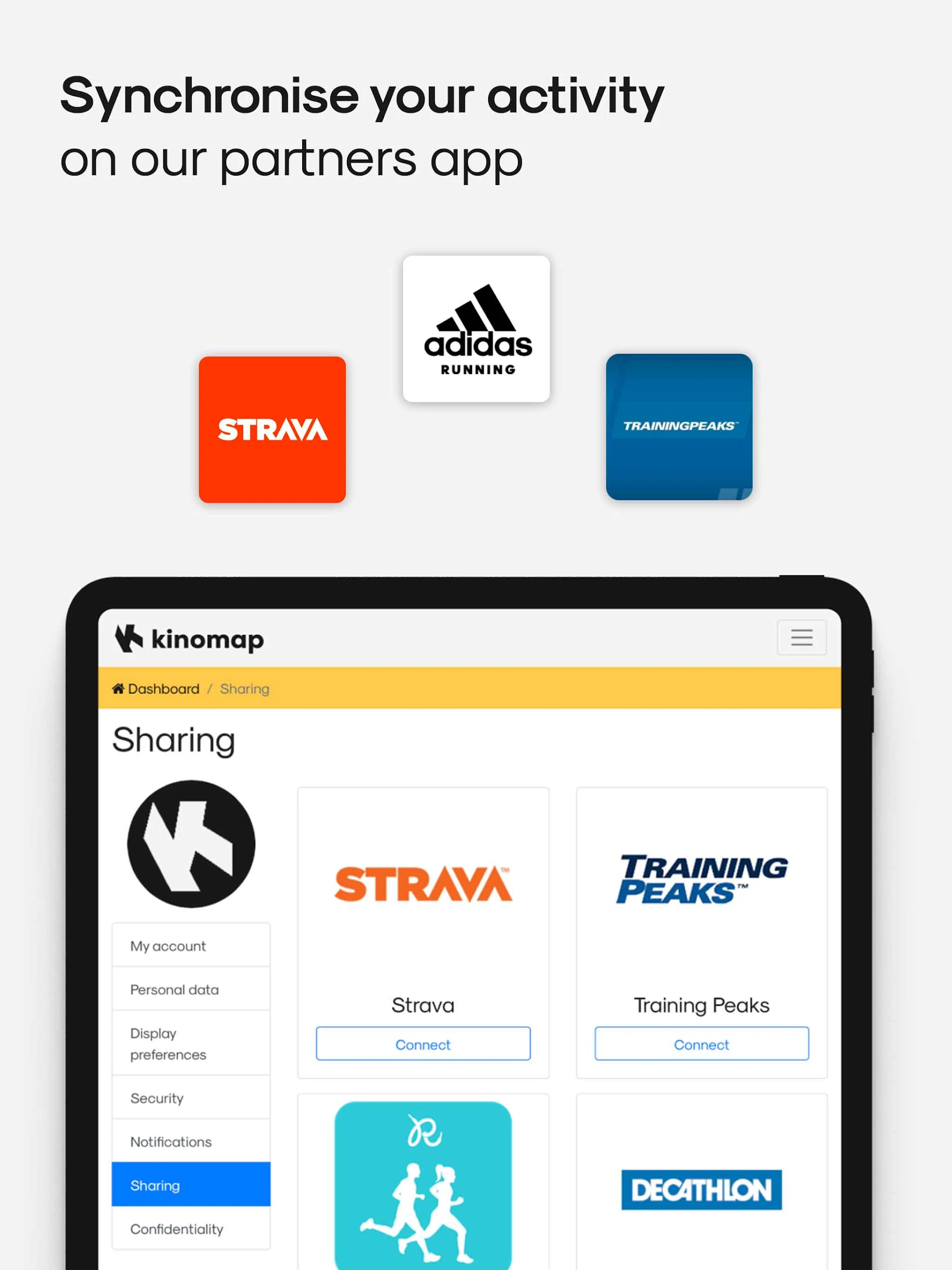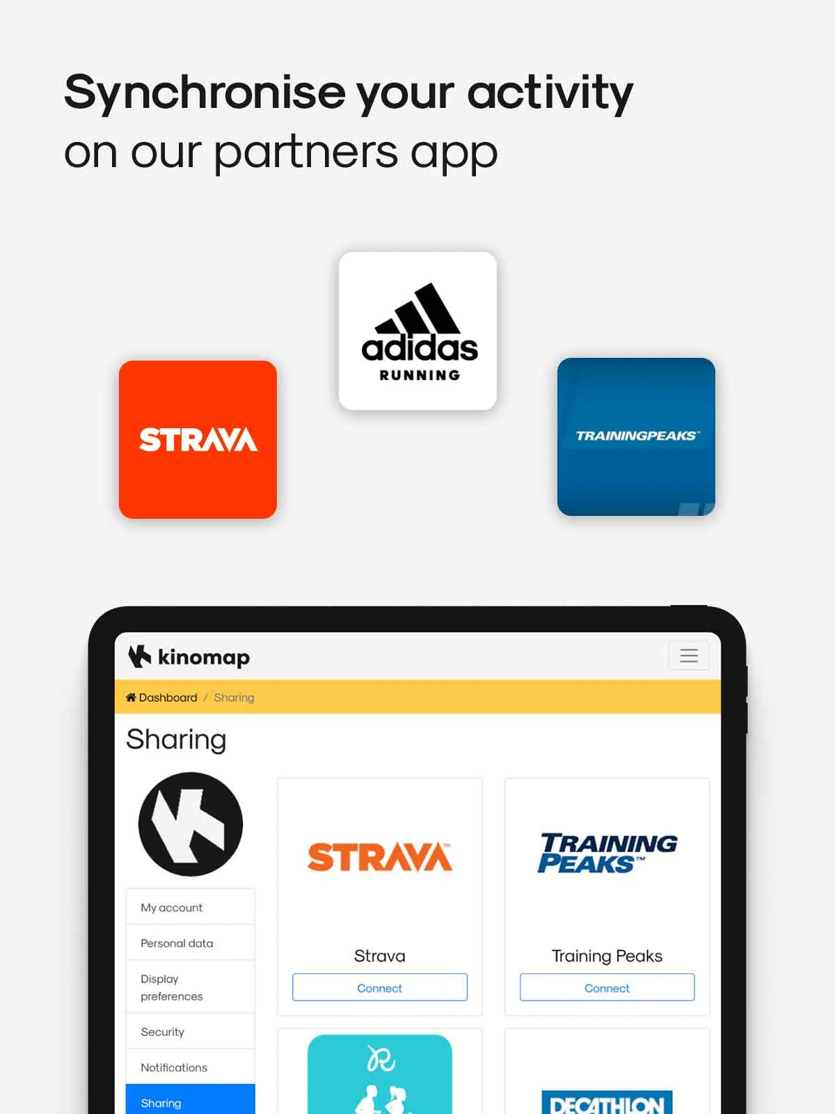 - Sync your Kinomap activities with partner apps like Strava and adidas Running.