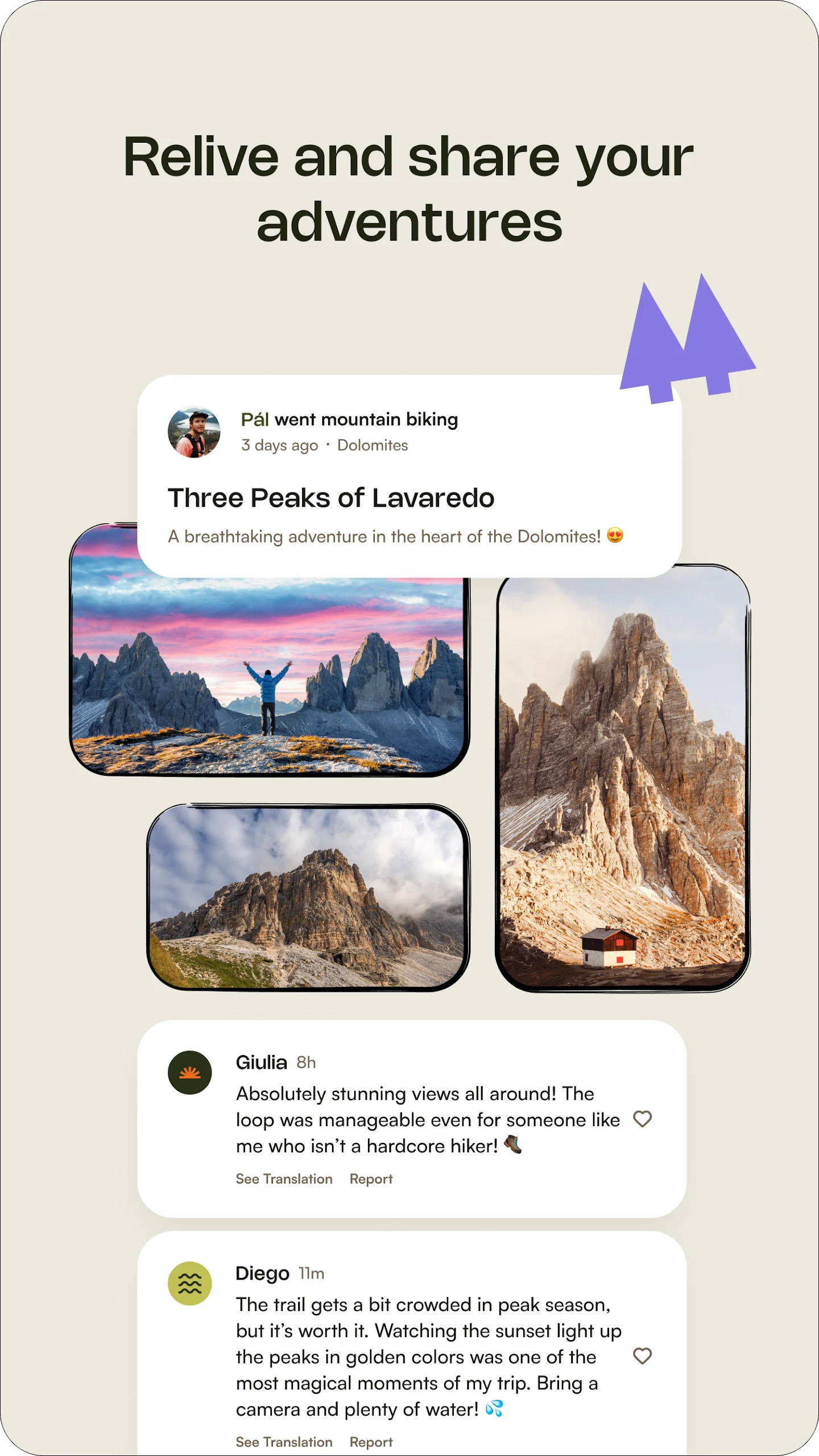 Keep a record of your biking, walking, and running journeys using the GPS tracker. Add photos, Highlights, and tips to create your personal adventure log, storing your favorite experiences permanently. Keep them private or share them with the komoot community. Follow friends and like-minded adventurers to stay updated on their outdoor escapades.