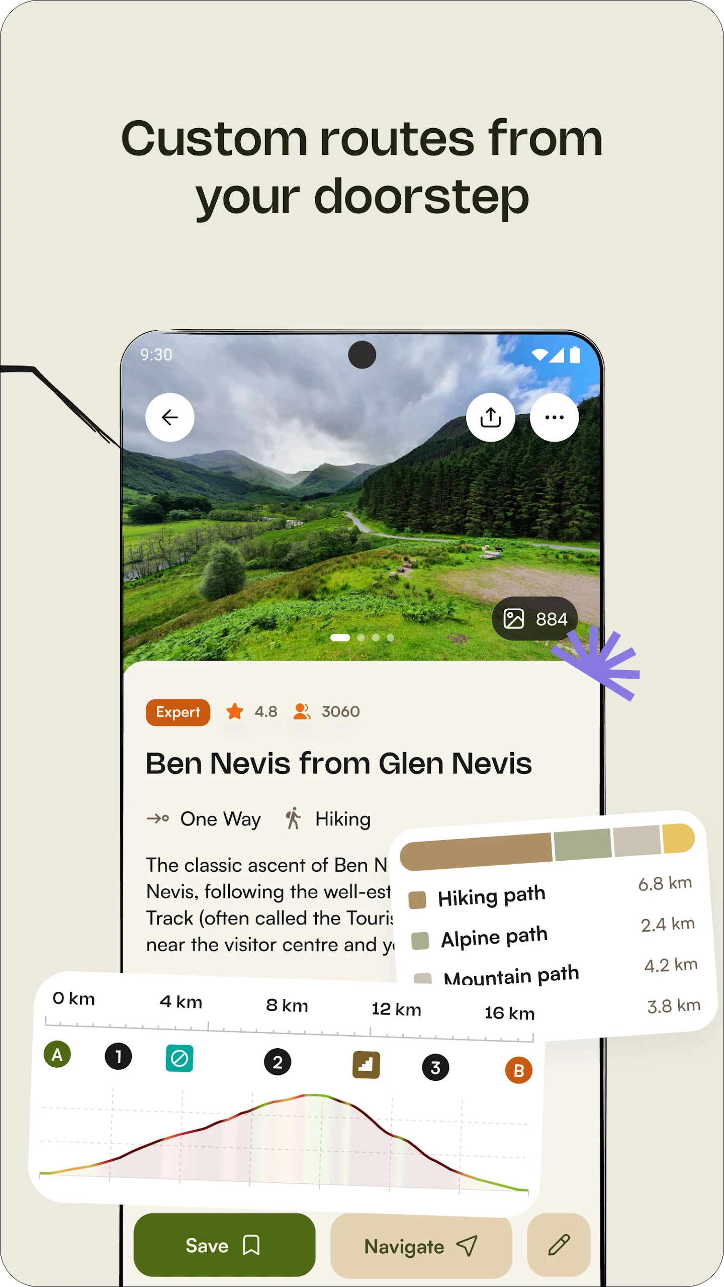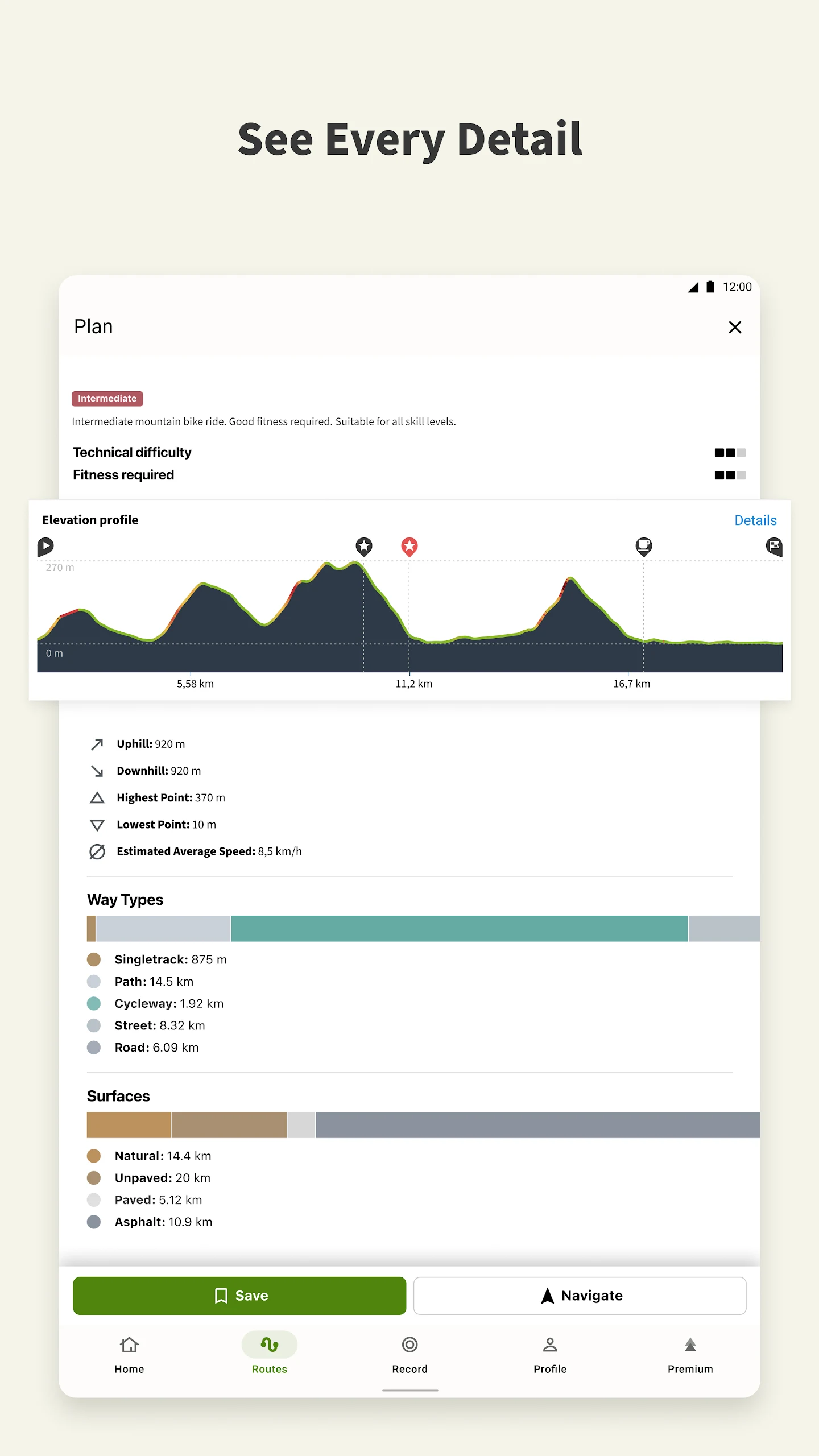 Tailor your route to suit your preferred activity—whether it's smooth roads for your road bike, single tracks for your mountain bike, quiet cycling paths for touring, or natural hiking trails for your walks. Plan meticulously with essential details like surface type, difficulty level, distance, and elevation profile at your fingertips, and track your progress with the GPS tracker while running, walking, or cycling.