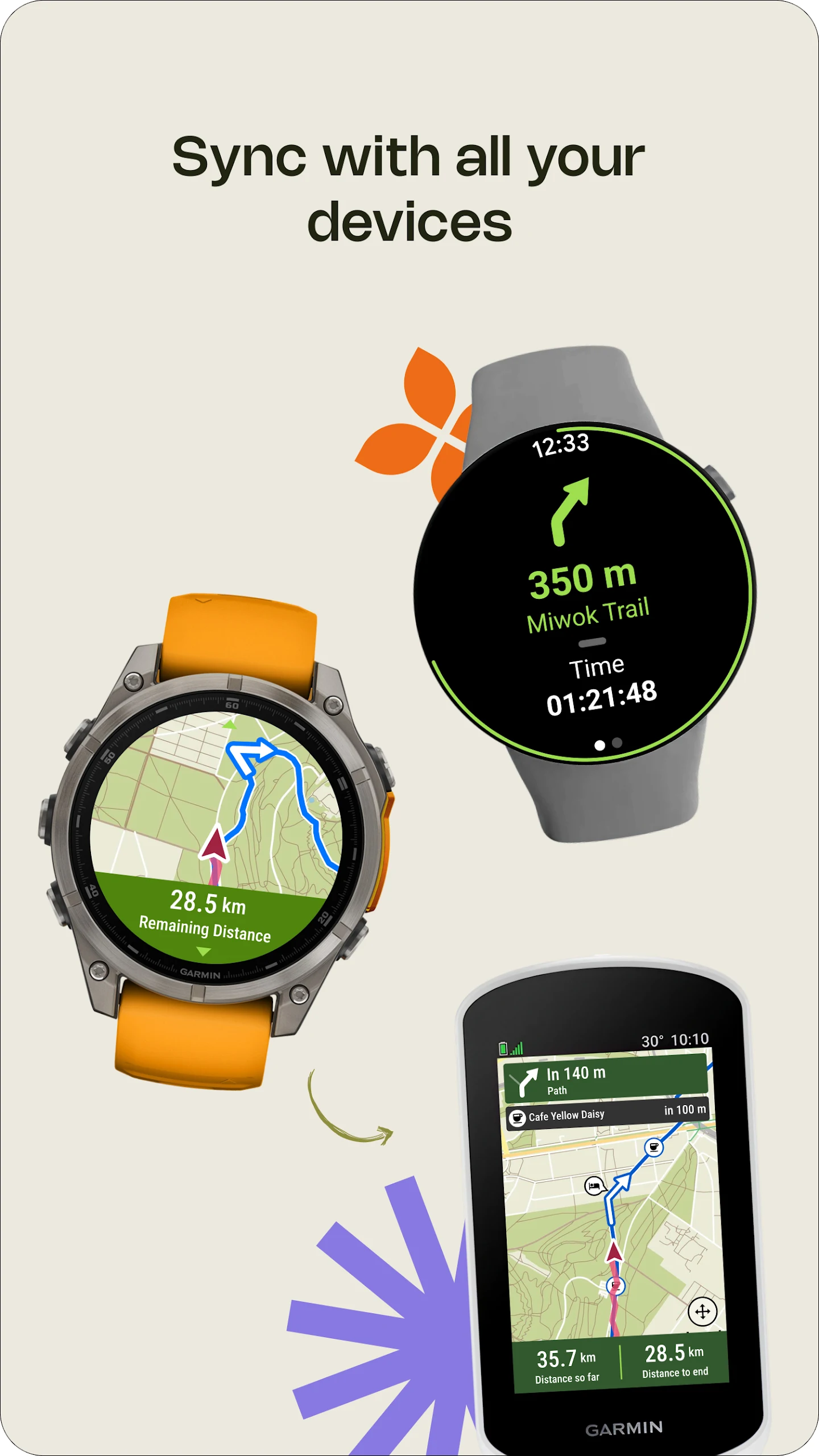 • Garmin - Download the komoot Garmin app in the IQ store and sync your accounts via Garmin Connect to share your walking, running, and biking GPS routes with your Garmin device.