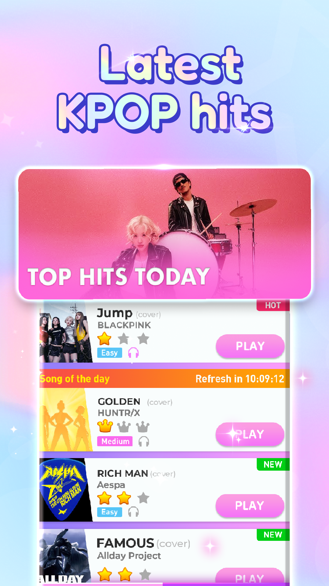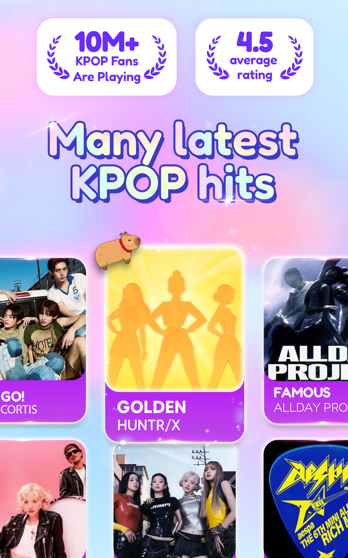 Jam out to the latest Kpop melodies. The game is regularly refreshed with the hottest tracks from a variety of artists, including Jung Kook, Black Pink, NewJeans, BTS, Big Bang, SNSD, Aespa, Stray Kids, Twice, ITZY, and more. Experience your personalized Kpop concert!