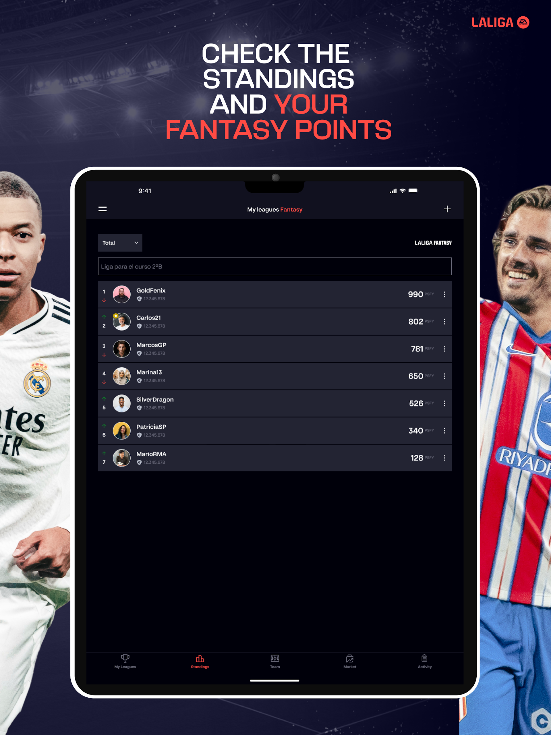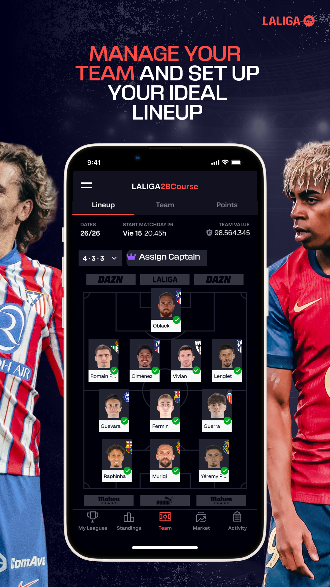 Prepare your football team each matchday with players like Vinicius, Lamine Yamal, Nico Williams, or Griezmann and become the best Fantasy football manager.