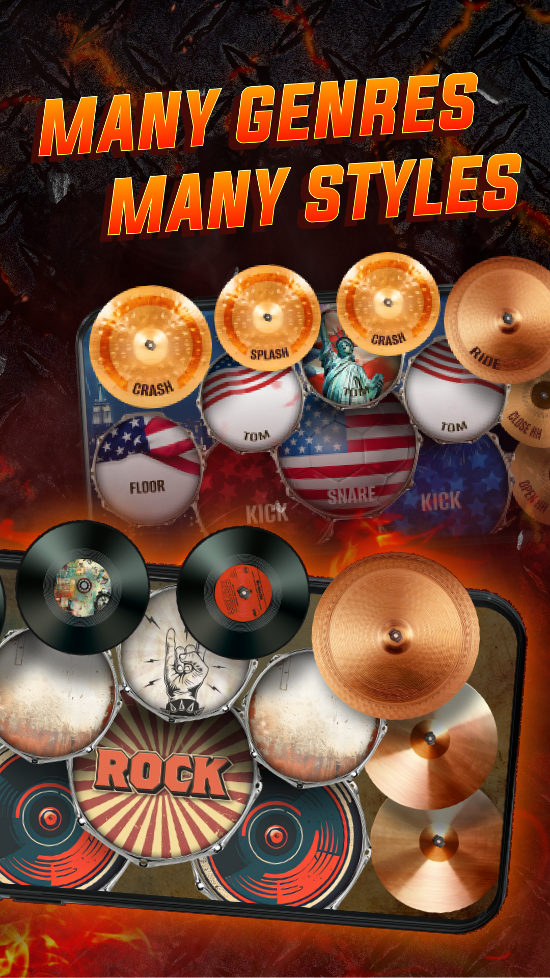 - Customize your drum kit with distinct musical styles: Heavy Metal, Pop Rock, Jazz, and more