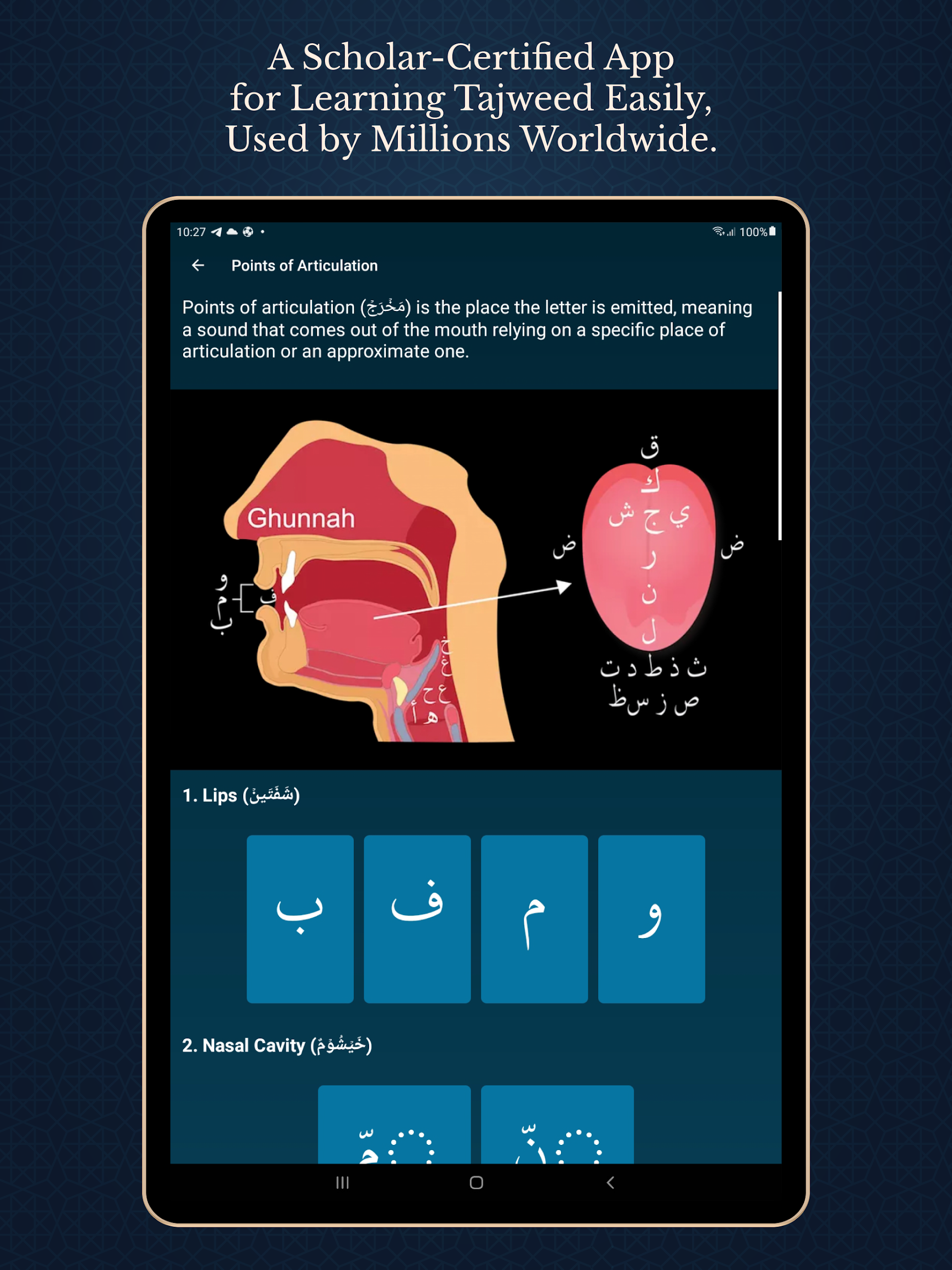 ✔ Visual Aids: Graphics and videos to clarify complex concepts like makharij and ishmam.