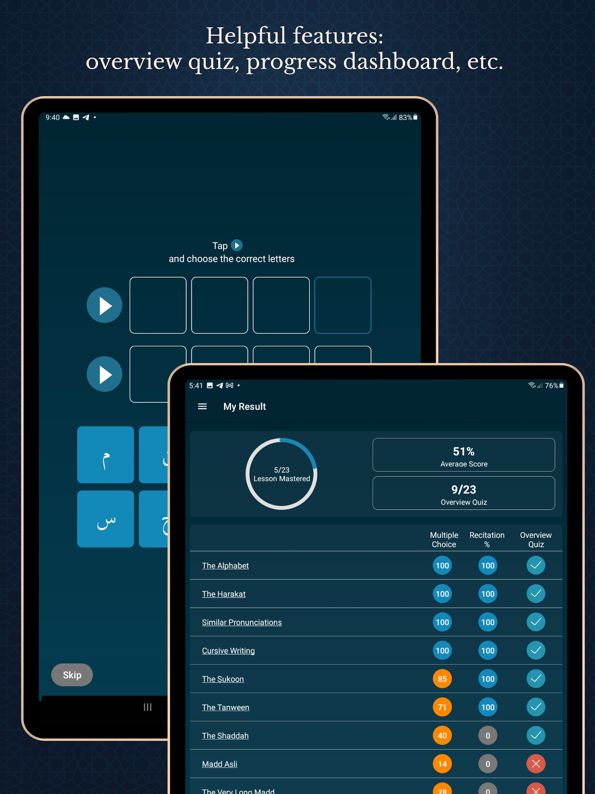 You can use Learn Quran Tajwid on any Android and iOS devices without losing any feature. However, we recommend to use tablet or iPad (devices whose screen is larger than 6 inches) for better experiences.
