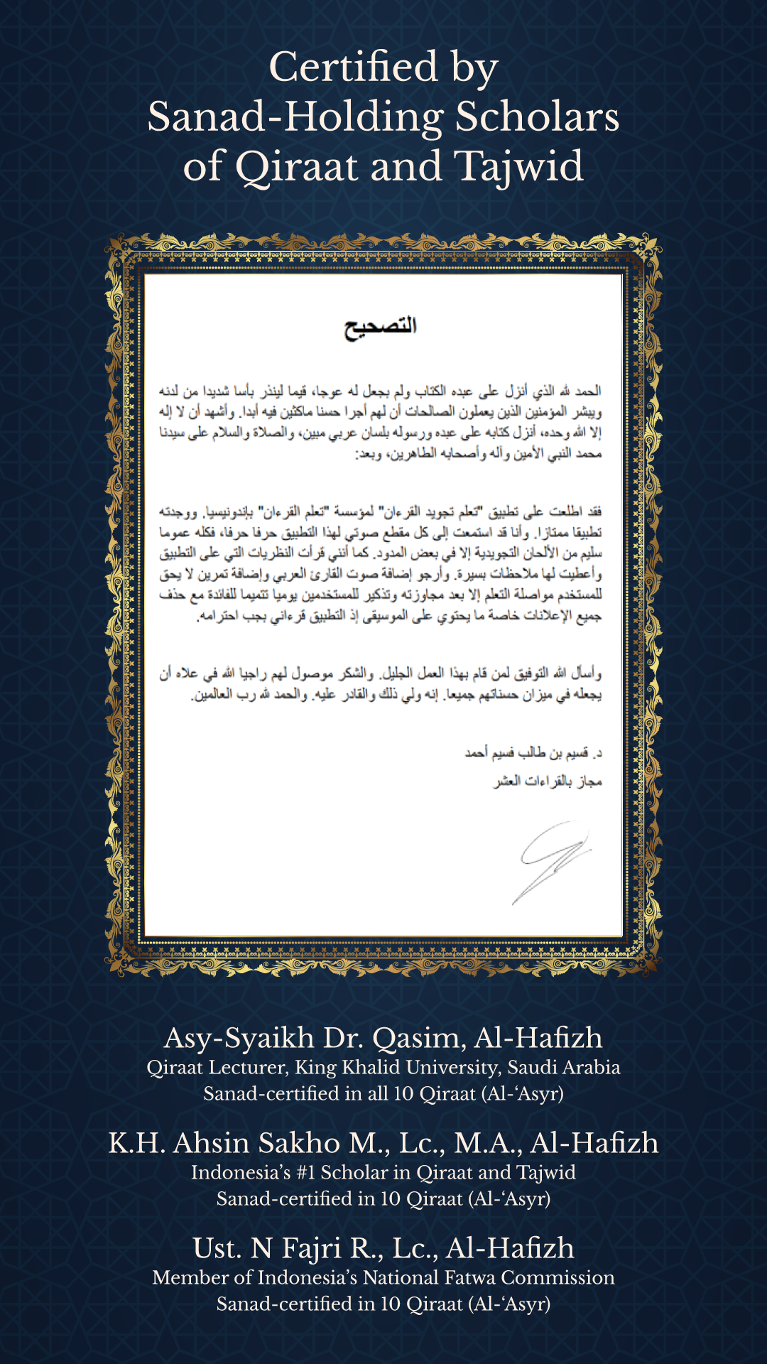 Learn Quran Tajwid has been checked by many people including scholars/ulama of Quran. Among them are K.H. Dr. Ahsin Sakho, which is one of the most prominent Quran scholars in Indonesia. You can see all of our advisors which checked the contents in our app here.
