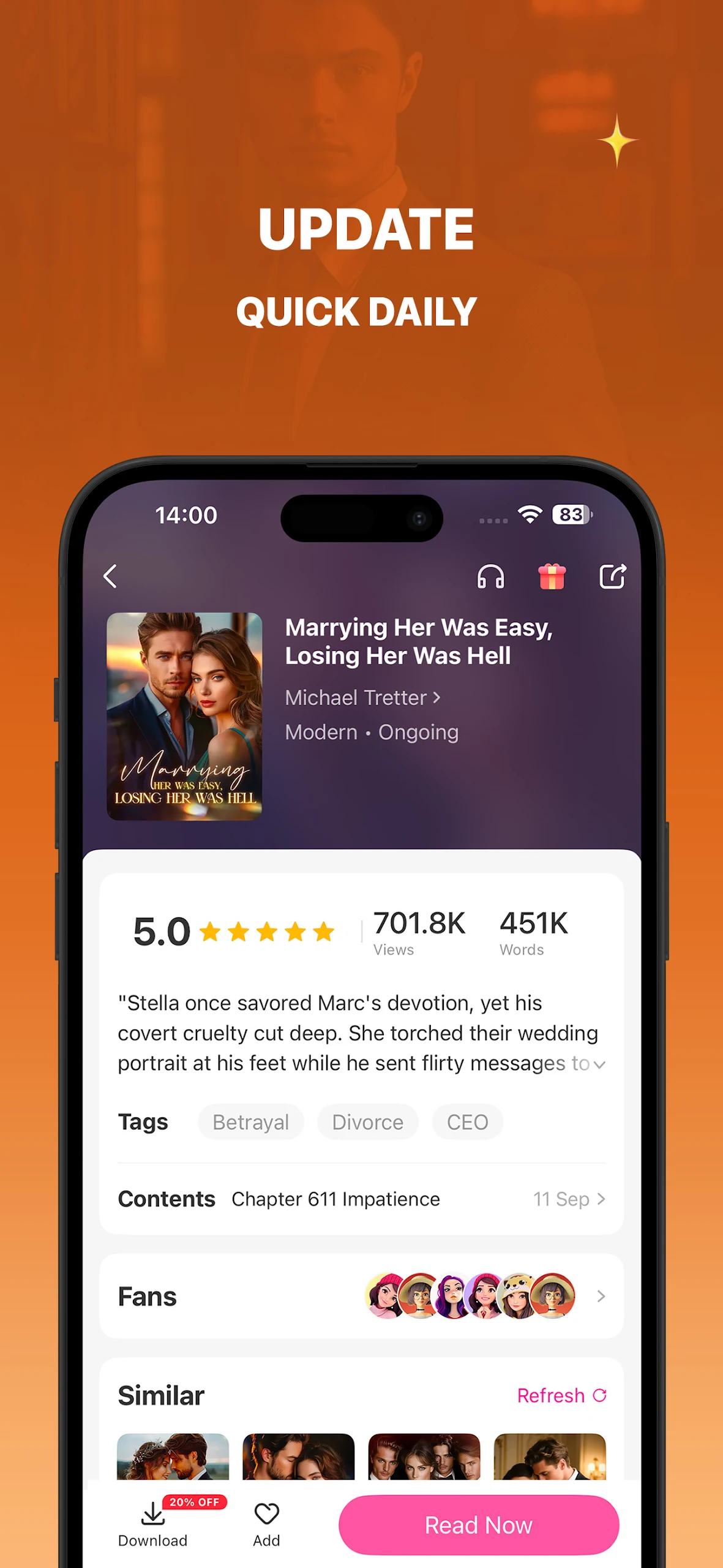 If you enjoy reading romance, horror, adventure, and fantasy novels, then Lera is the perfect platform for you. Dive into episodes of diverse genres, ranging from supernatural tales with shape-shifting werewolves to romantic narratives featuring billionaire bosses. At Lera, there is a novel or story tailored for every reader, with new chapters updated daily.