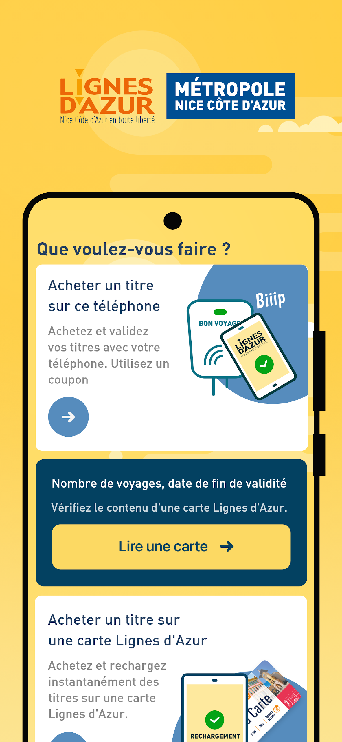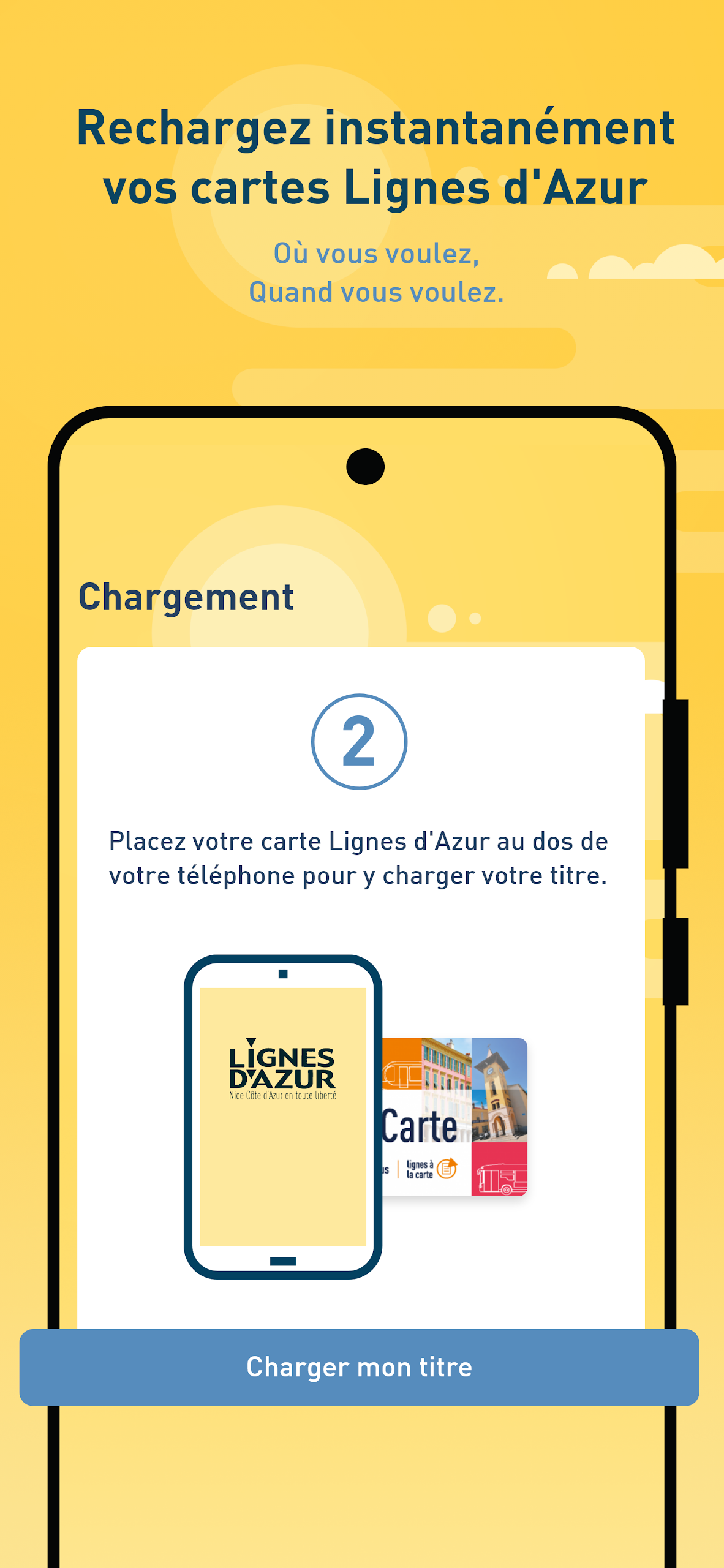 Load fares either onto a physical Lignes d’Azur card (“Ma Carte” or “La Carte”) via NFC or directly onto your phone if it supports NFC.