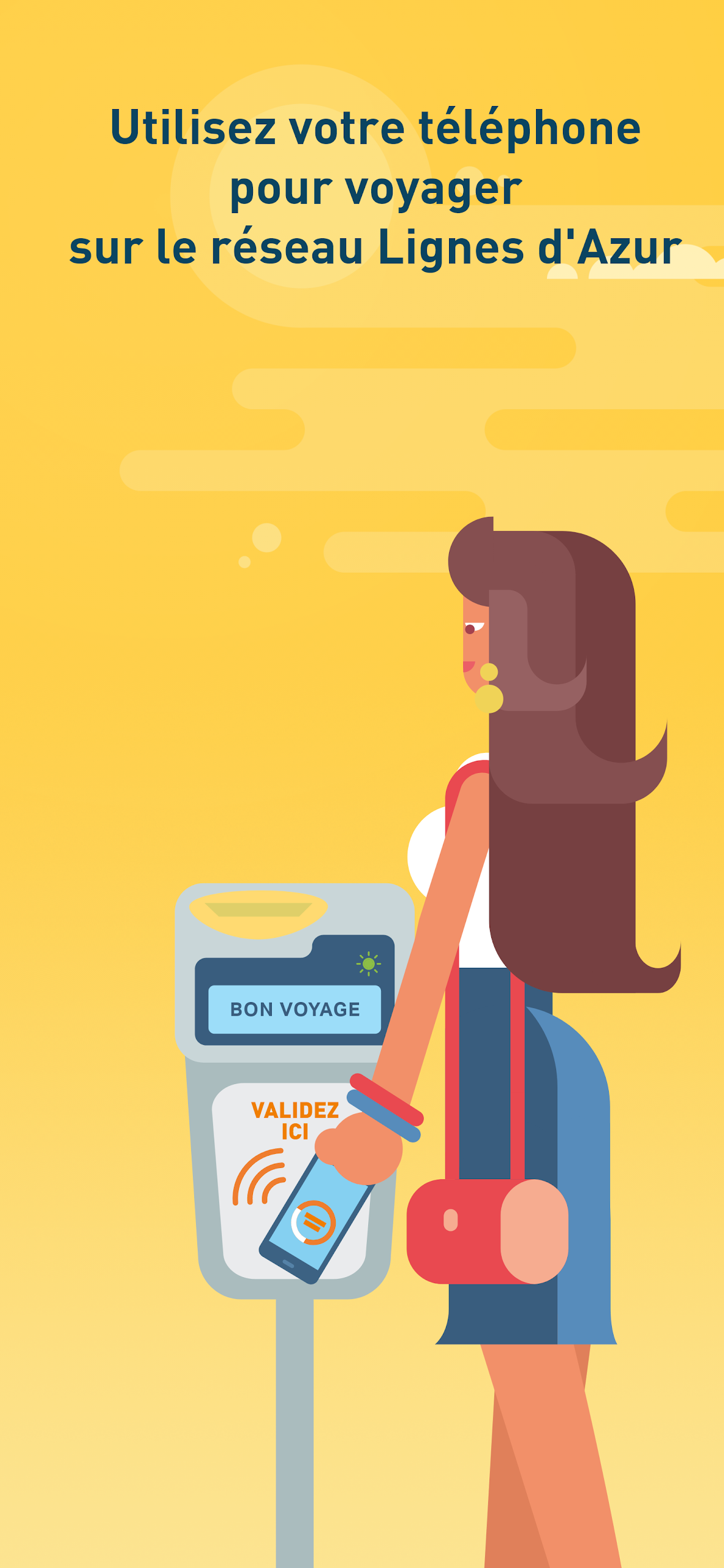 • After your transaction is finalized, you can use your phone to travel on the Lignes d'Azur network. Validate your ticket by holding the back of your phone, screen facing up and NFC activated, against the validation terminal without needing to open the app. A beep sound and the green light activation on the terminal will confirm that your pass has been validated.